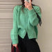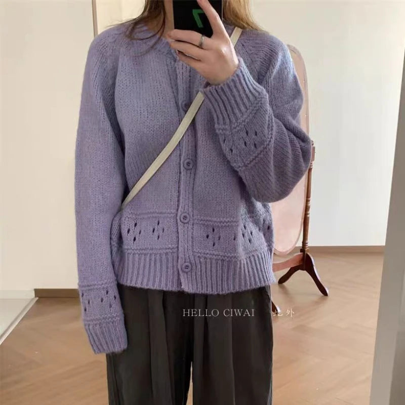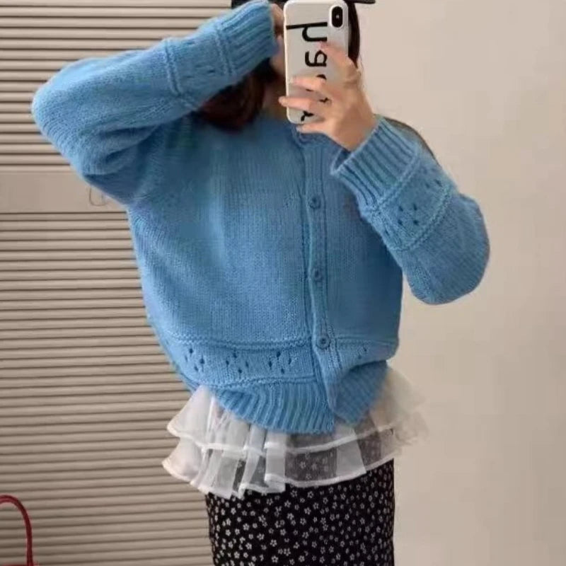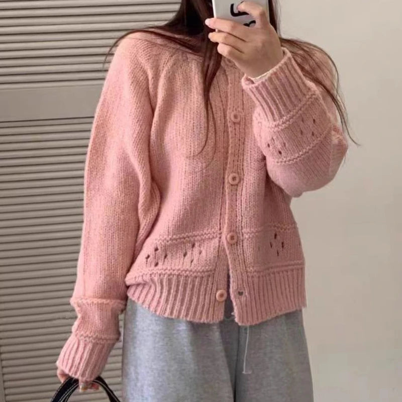 Hnewly Pointelle Cardigan Women Long Sleeve Crew Neck Button Down Knit Sweater Jacket Autumn Winter French Chic Outfit