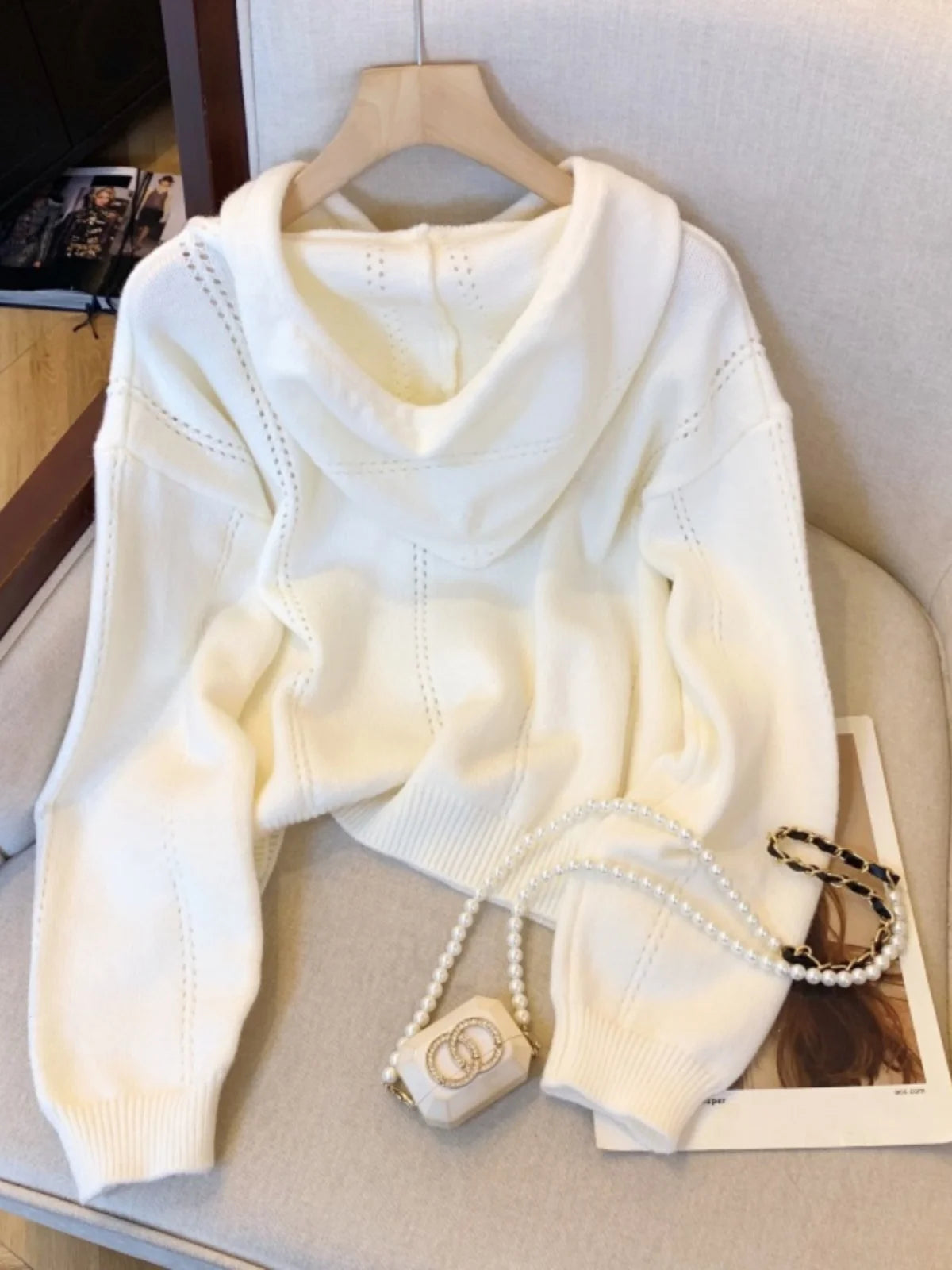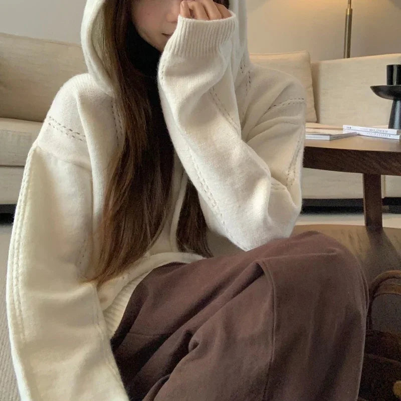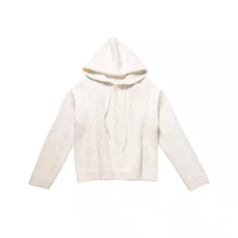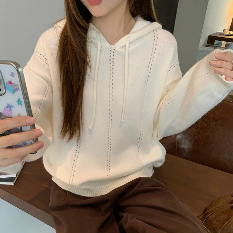 Hnewly Pointelle Knit Hooded Sweater for Women Long Sleeve Pullover Sweater Hoodie Cosy Knitwear Teen-girl Autumn Winter Casual Outfit