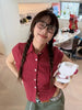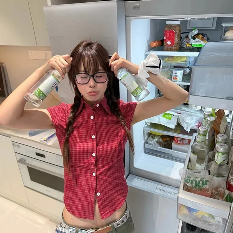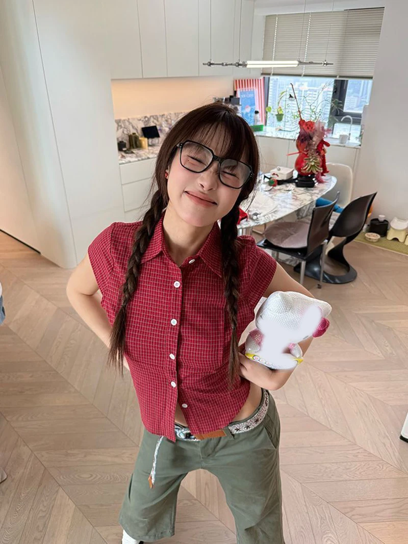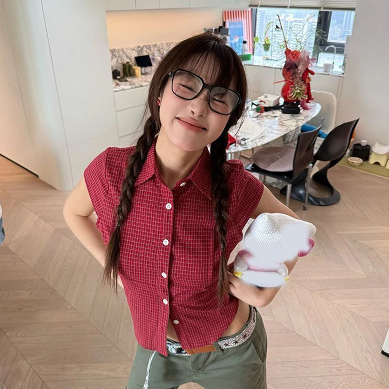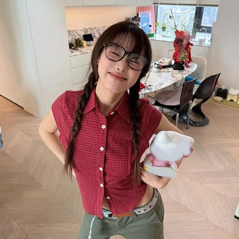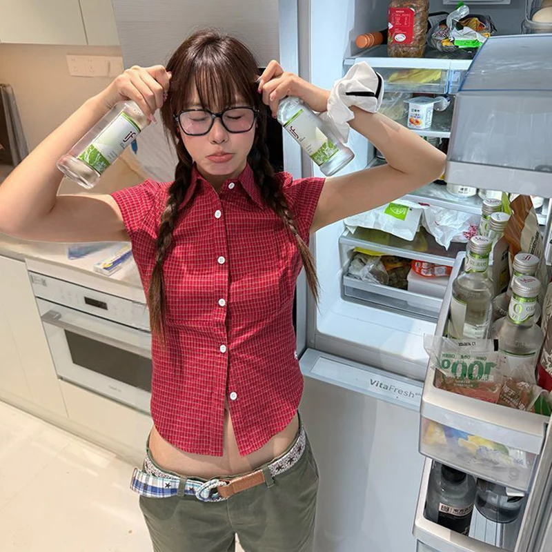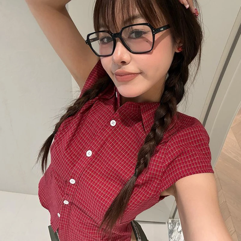 Hnewly Pure Cotton Red Plaid Shirt Women Slim Sexy Cropped Short Sleeve Y2K Blouse Vintage American Streetwear Female Summer Tops