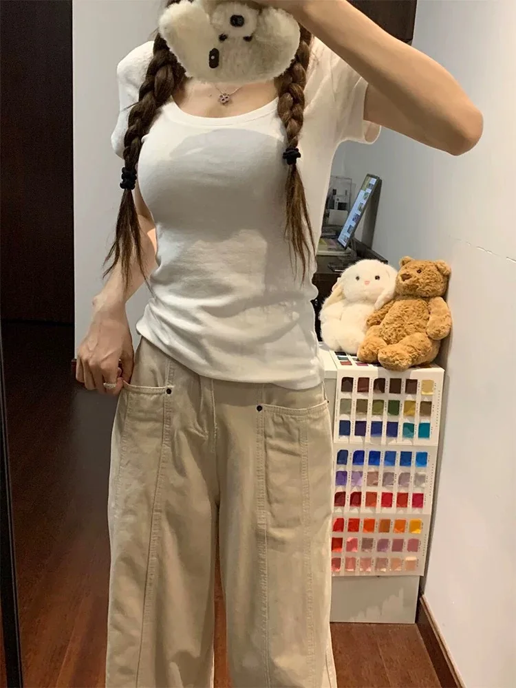 Hnewly Retro American Beige Denim Jeans for Women streetwear baggy High Waisted Flare 1950s/1960s Jeans Vintage Cargo Pants