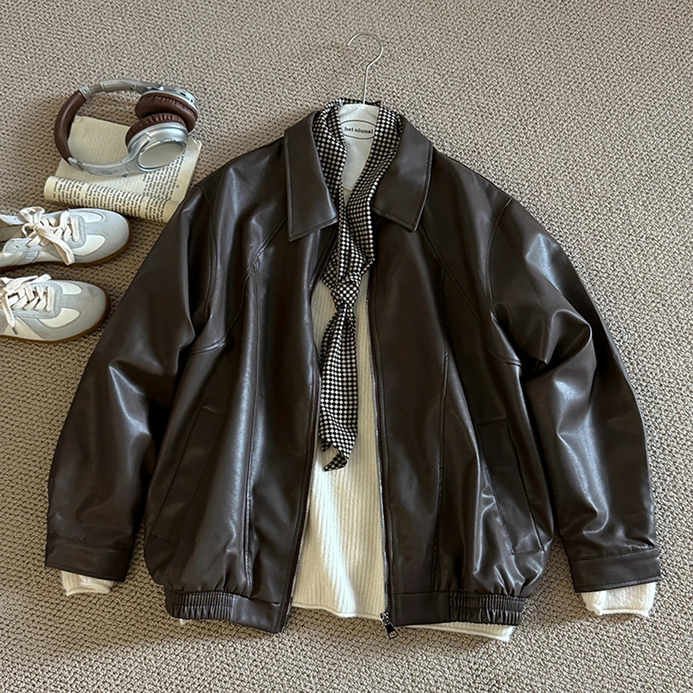 Hnewly Retro Chic pu Leather Jacket Women's 2025 Spring Autumn Fashion Lapel Versatile Windproof Sweet&Cool BF Style Female Outerwear
