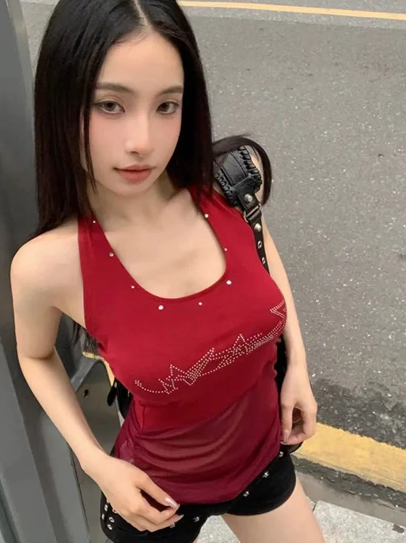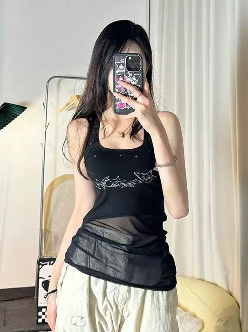 Hnewly Retro Halter Neck Camis for Women Summer Sexy U Neck Streetwear Sleeveless Crop Tops Y2K Aesthetic Mesh Patchwork Hot Girls Tank