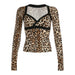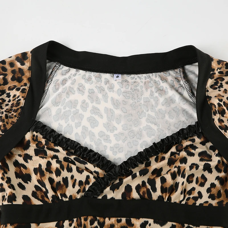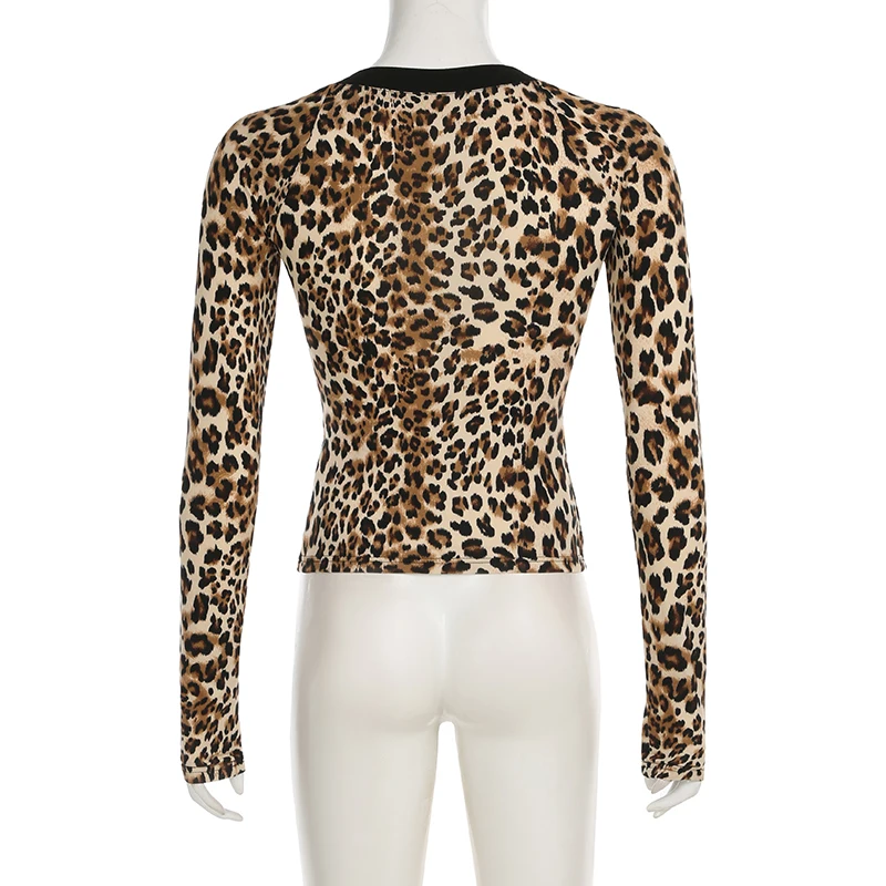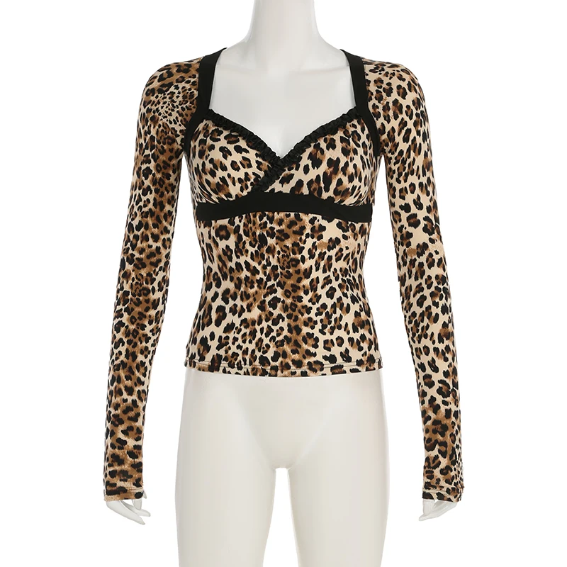 Hnewly Retro Leopard Print Crop Top y2k Vintage Square Collar Lace Stitching Full Sleeve T-shirt 2024 Autumn Harajuku Tees Lady