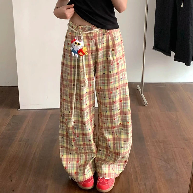 Hnewly Retro Plaid Patchwork Casual Pants Women Summer High Waist No Pendant Loose Wide Leg Pants Y2K Korean All Match Jogging Trousers