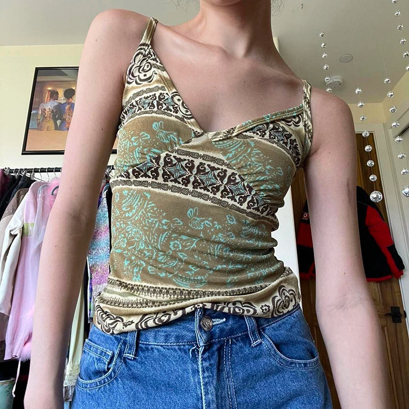 Hnewly Retro Print V-neck Camis Summer Holiday Graphic Sleeveless Skinny Crop Top Women Casual Vintage y2k Tees Streetwear Basic