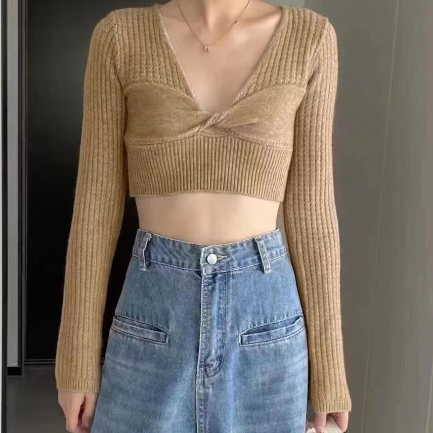 Hnewly Rib Knit Crop Top with Keyhole Criss-Cross Front Long Sleeve V-Neck Short Sweater Pullovers Women Teen-girl Y2K 90s Outfit