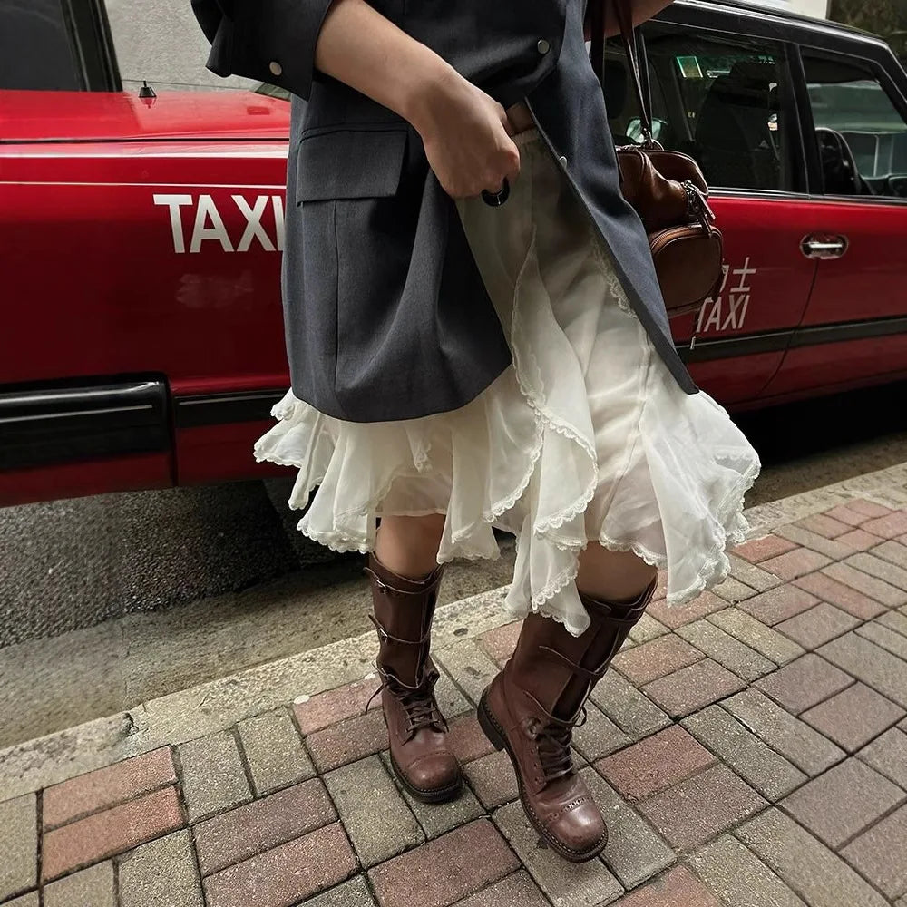 Hnewly Ruffle Lace Splicing Half Skirt for Women Elegant and Sweet Cake Skirt High Waist Lace Chiffon Half Skirt