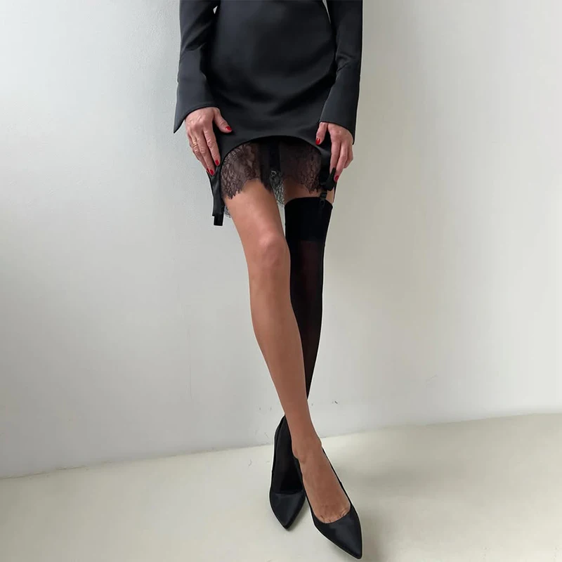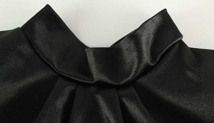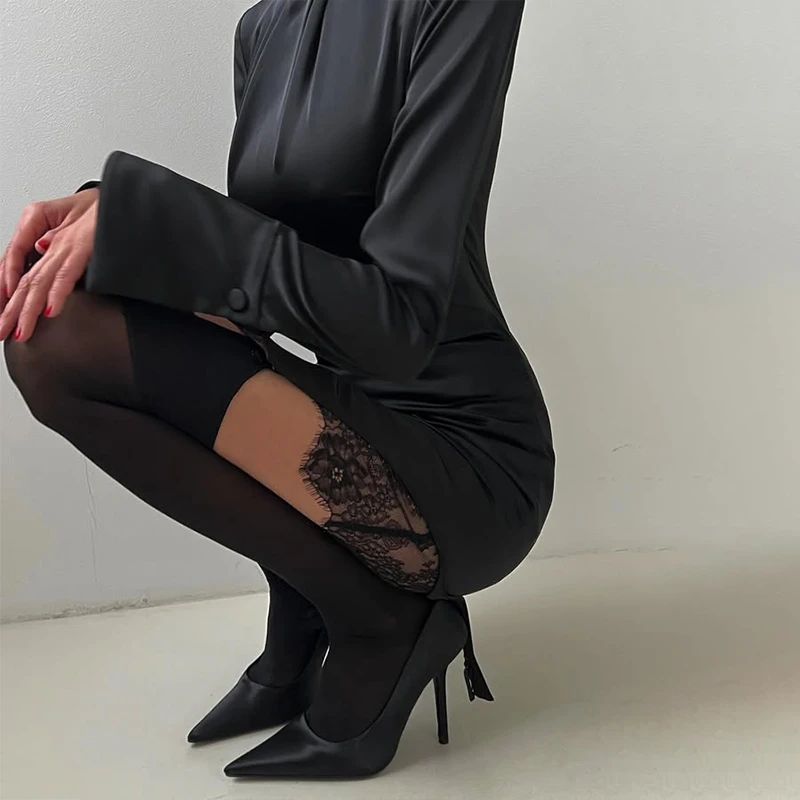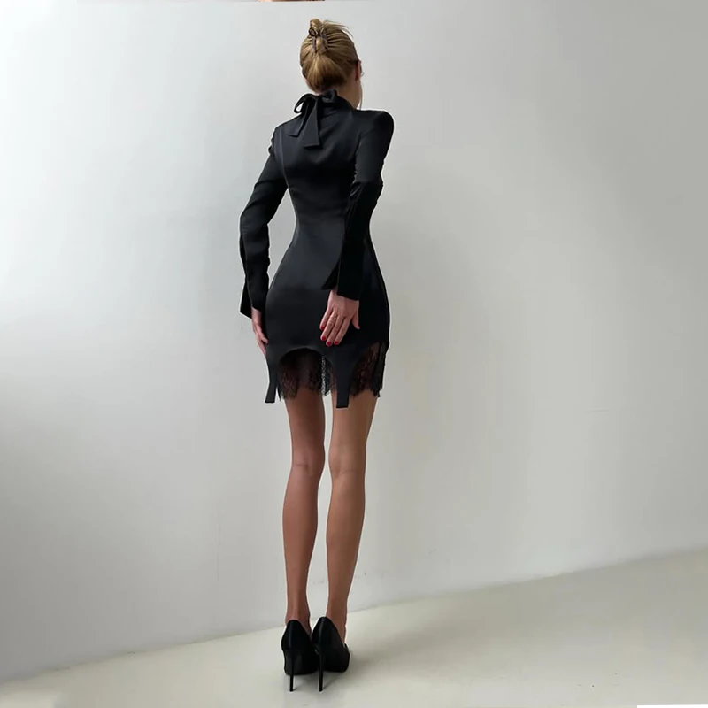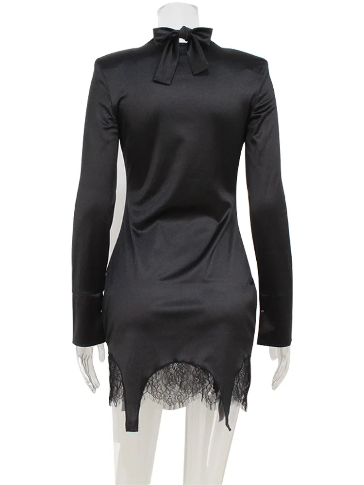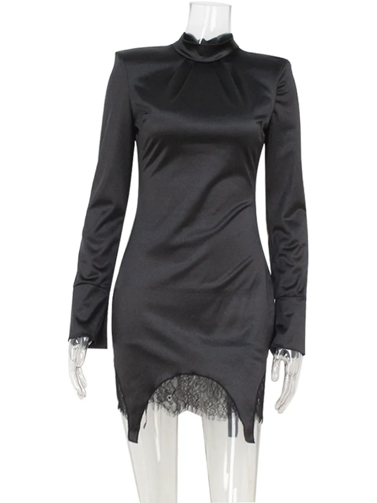 Hnewly Satin Lace Patchwork Dresses For Women Fashion Sexy Streetwear Solid Long Sleeves Sheath Turtle Neck Mini Vestidos Robes Female
