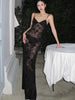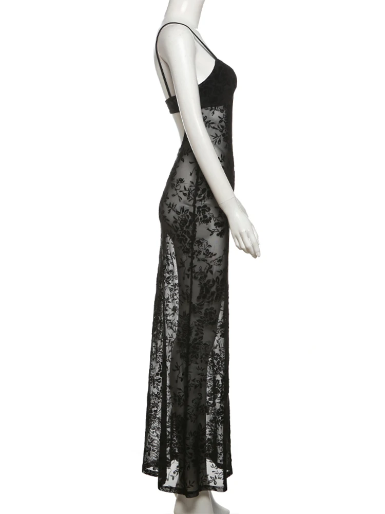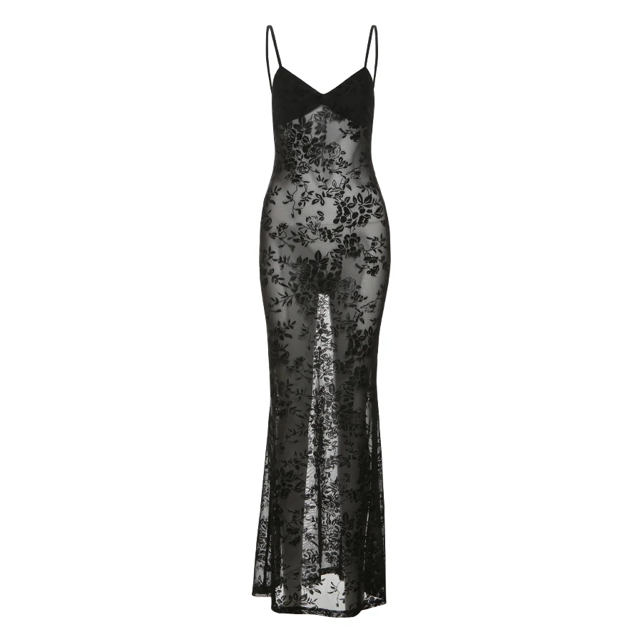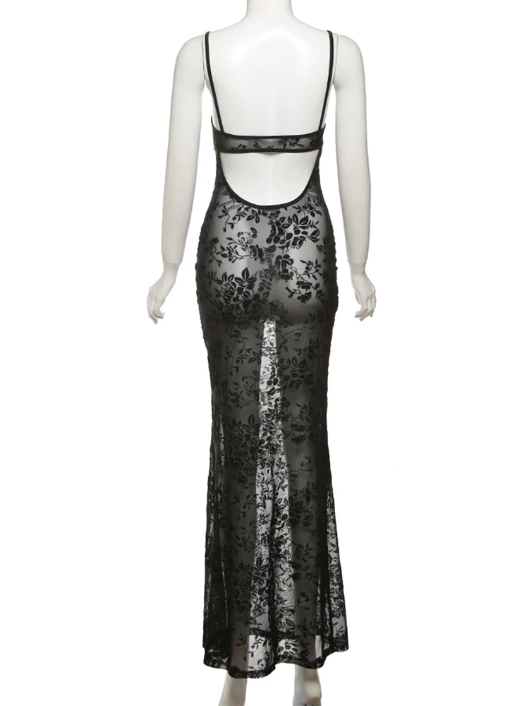 Hnewly See Through Dress Women Backless Hollow Flower Print Patchwork Solid Sleeveless Sexy Midnight Clubwear Party Vestidos