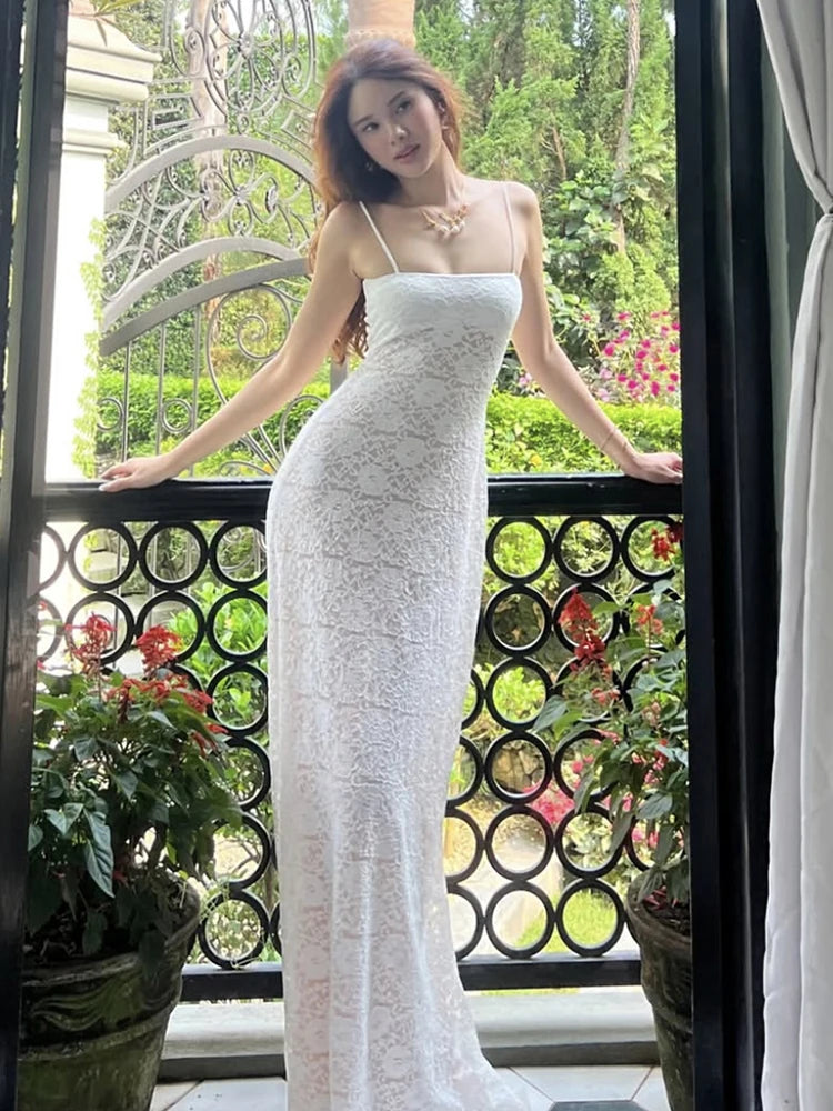 Hnewly See Through Dress Women Backless Sleeveless Cross Lace-Up Spaghetti Strap Sexy Flower Motif Midnight Club Vestidos
