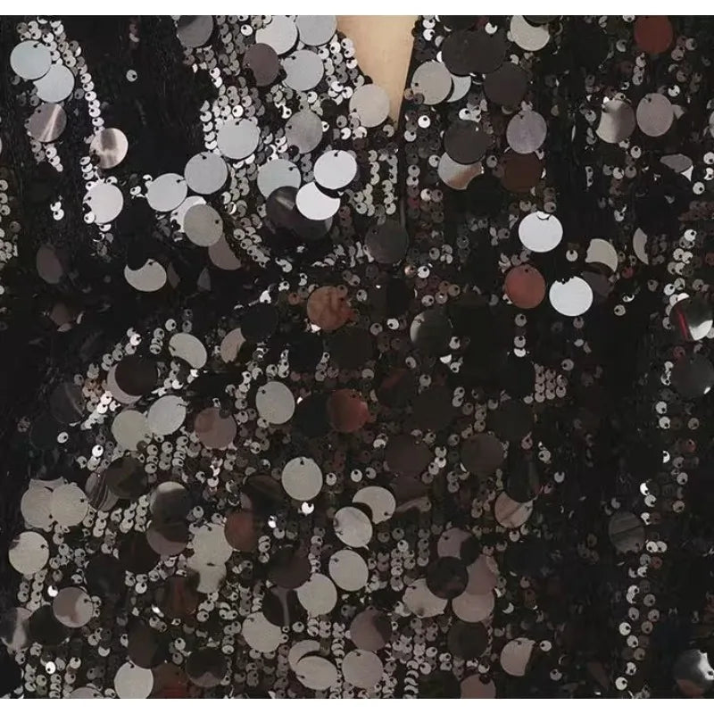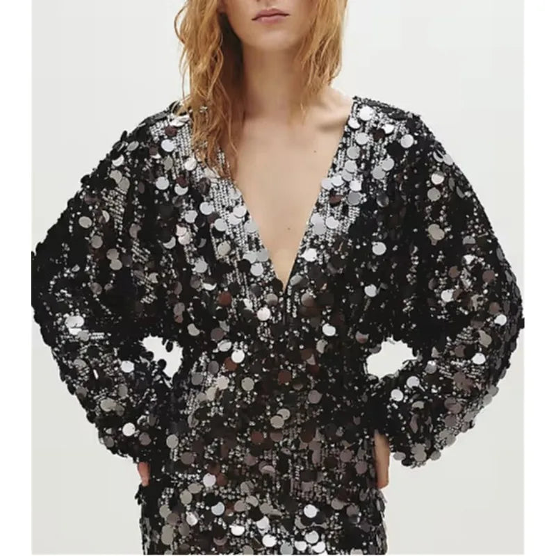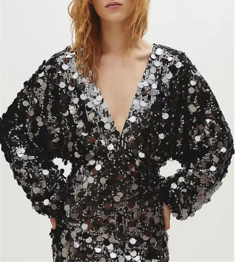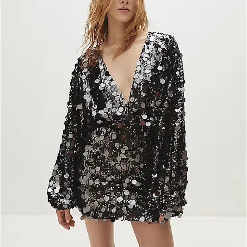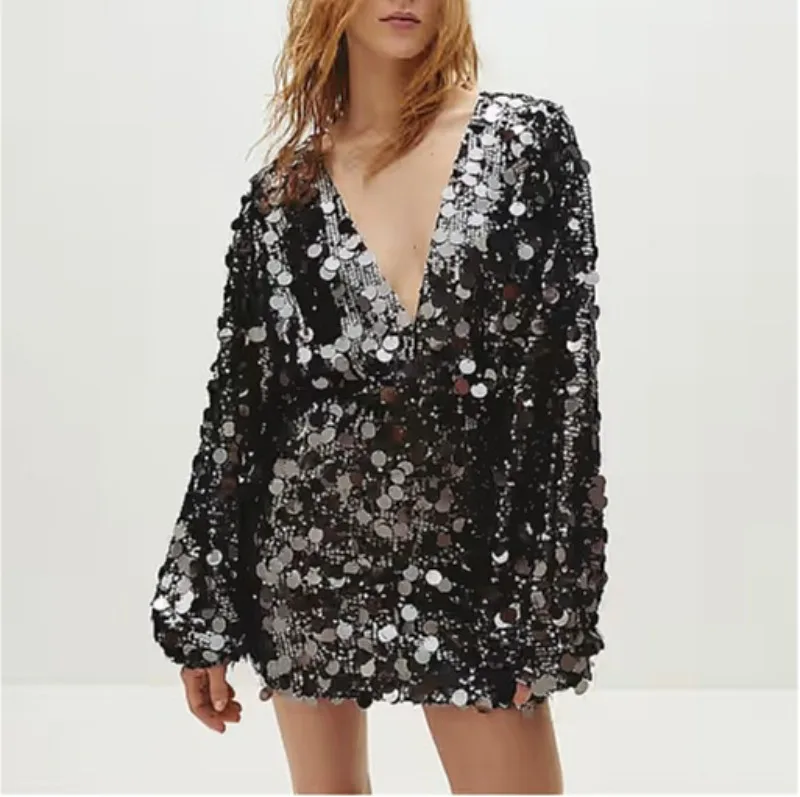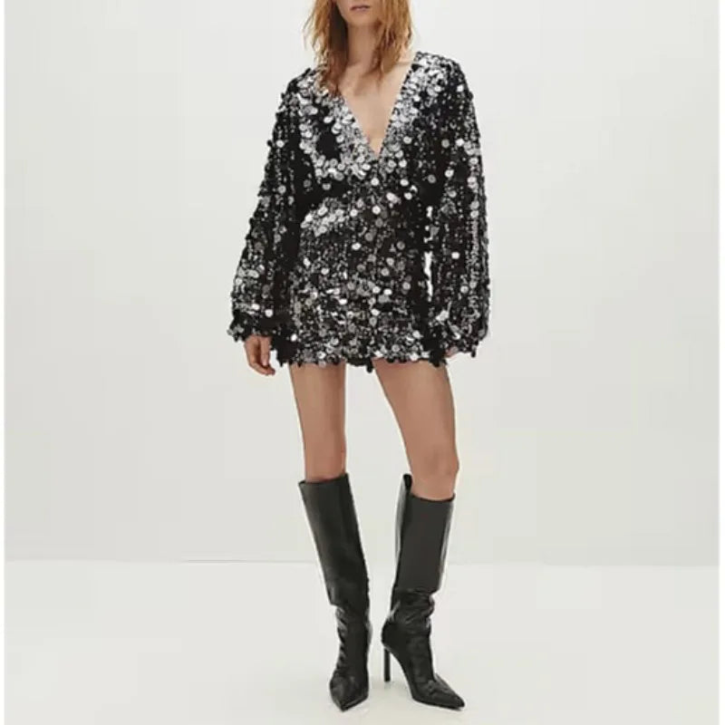 Hnewly Sequin Mini Dresses for Women Spring Autumn Sexy Deep-v Long Sleeve High Sleeve Hotgirl Birthday Party Dress