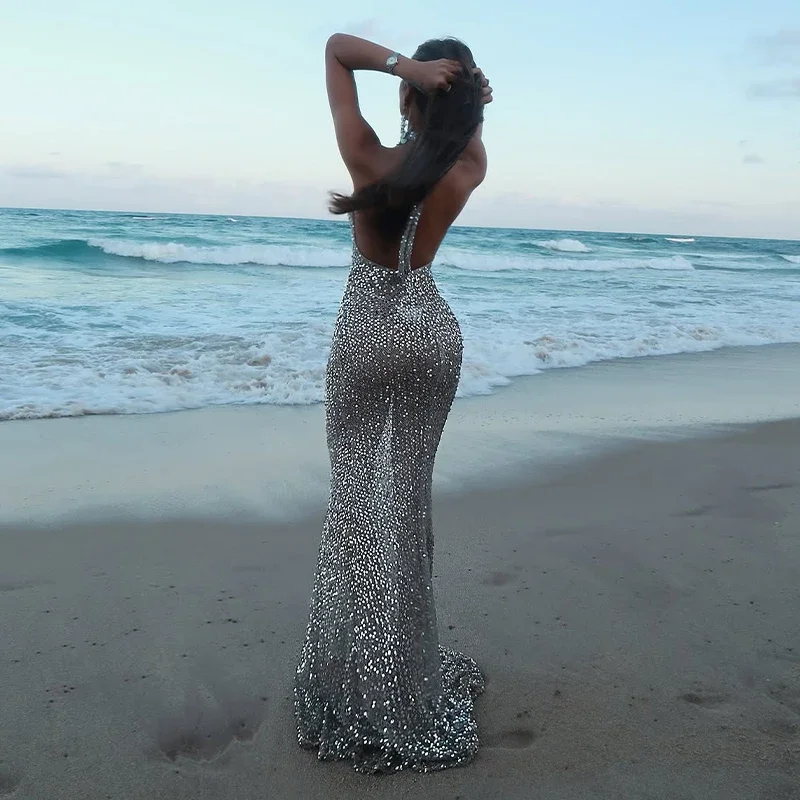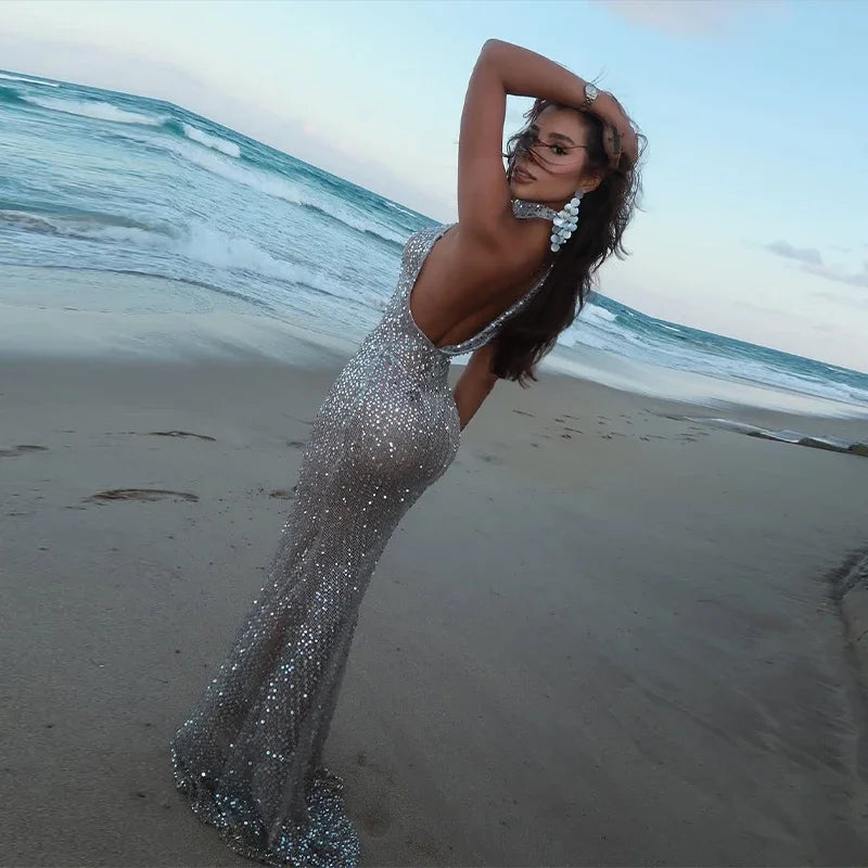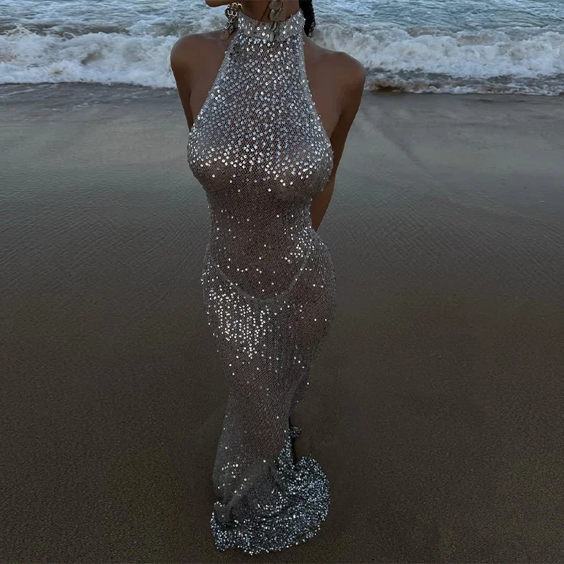 Hnewly Sequined Backless Halter Long Dress Women Sexy Beach Sleeveless Hip Package Female Dresses Spring Summer Lady Vacation Robe