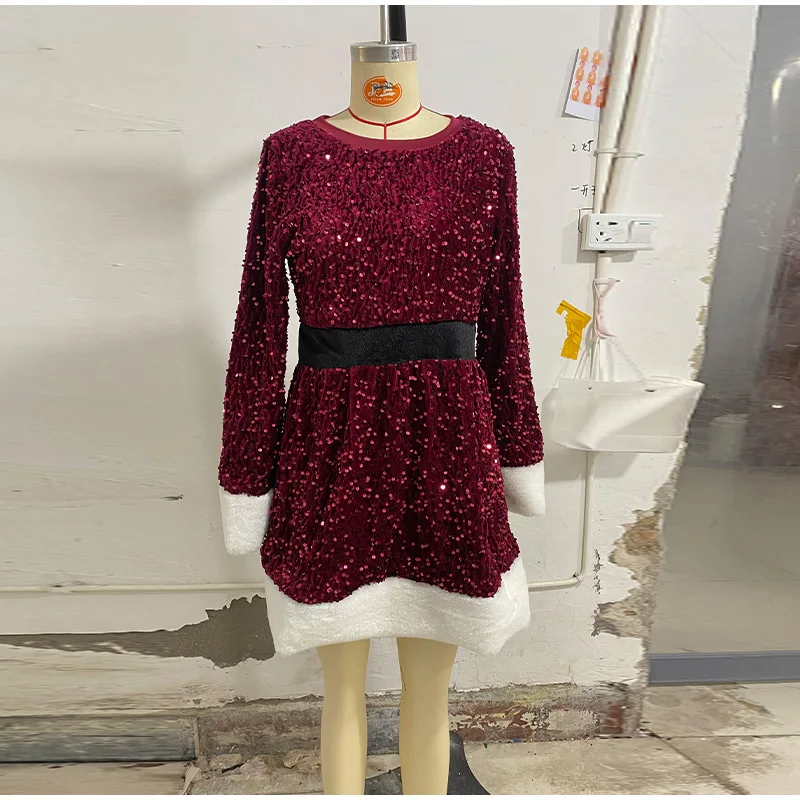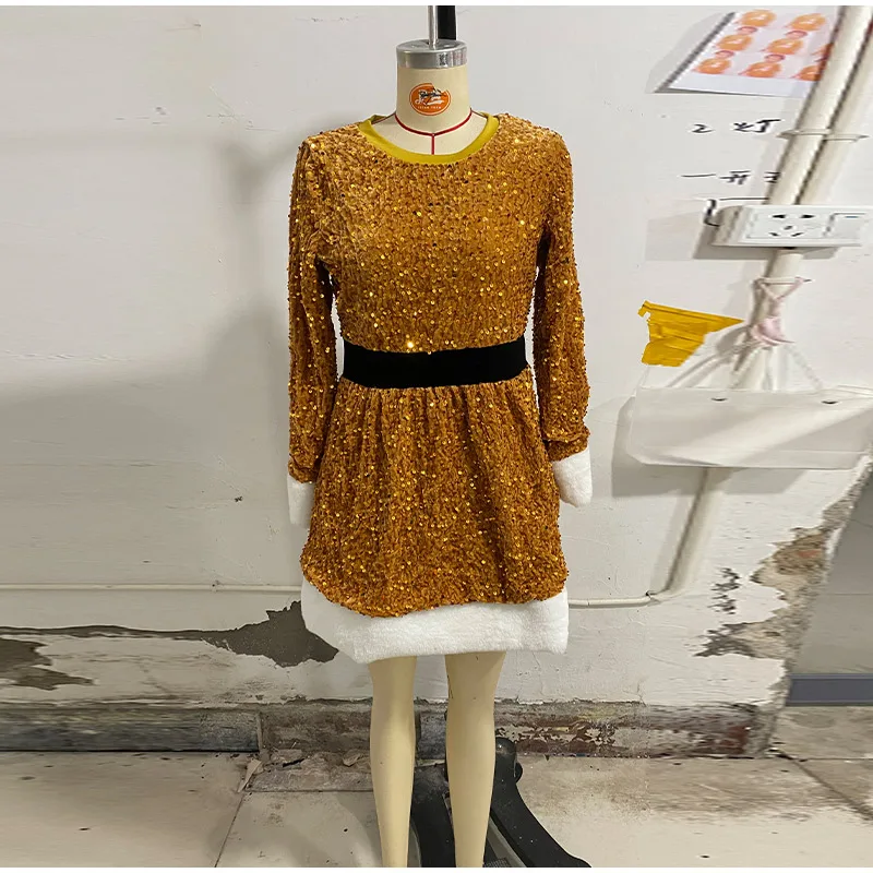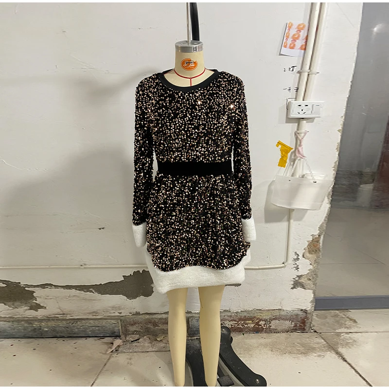 Hnewly Sequined Faux Fur Spliced Short Dress Women Pleated O-neck Long Sleeve A-line Dresses Winter Lady Christmas Party Gowns New