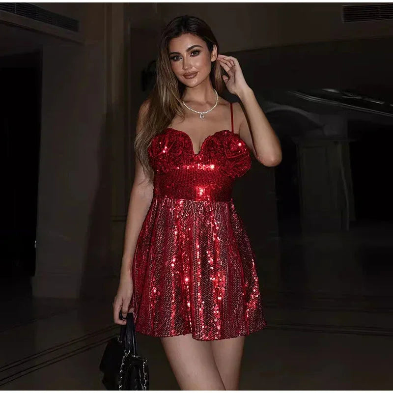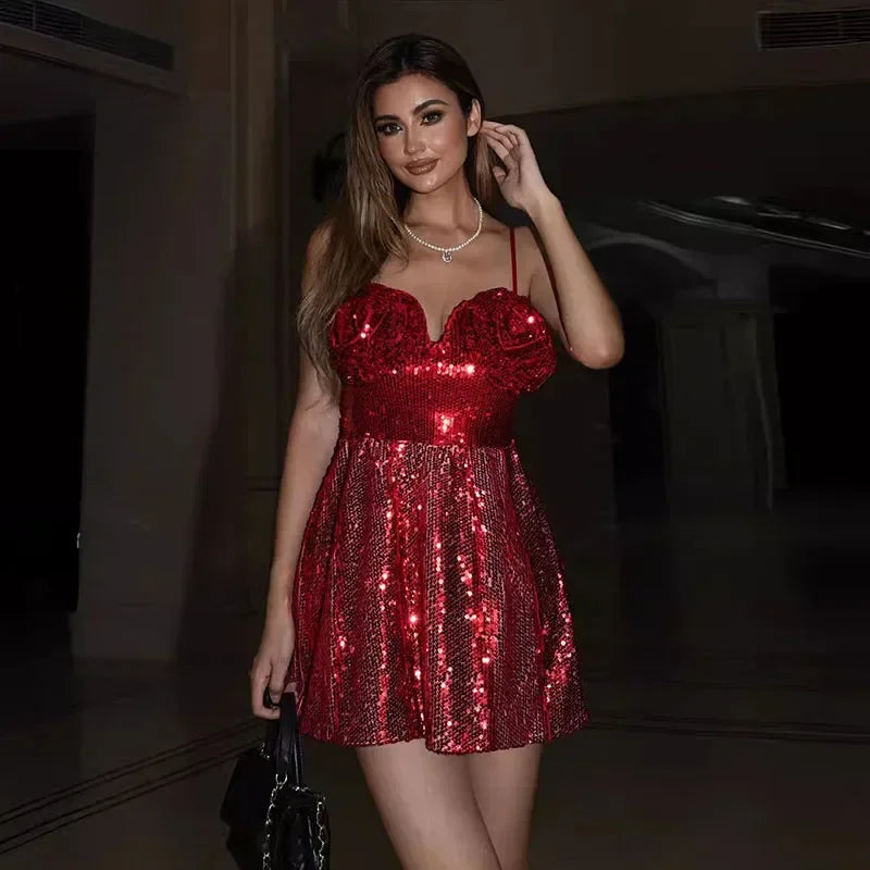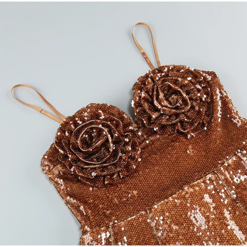 Hnewly Sexy 3D Flower Sequined Short Dress Women Sleeveless Backless Slash Neck Slip Dresses Summer Fashion Lady Tube Top Robe New