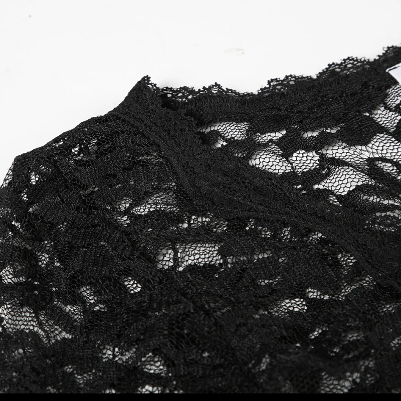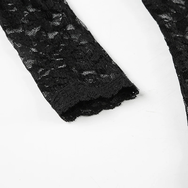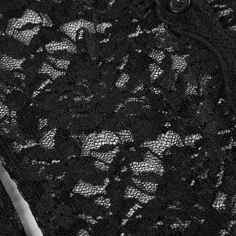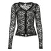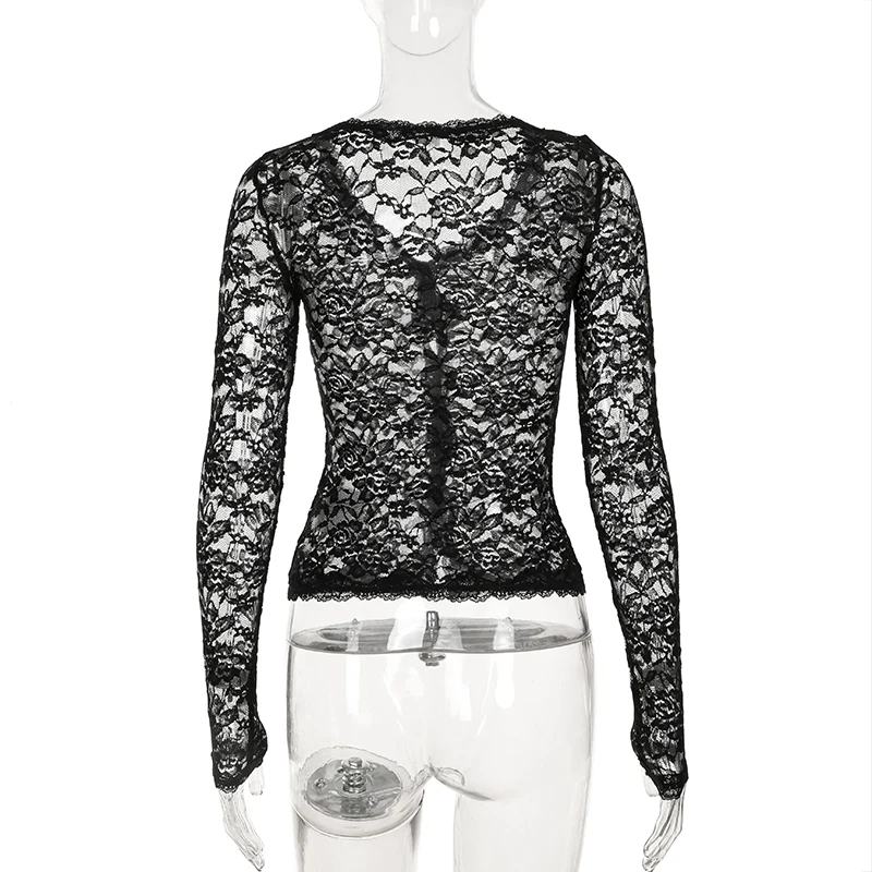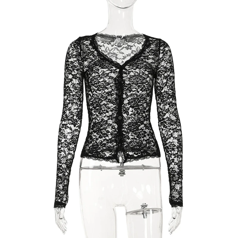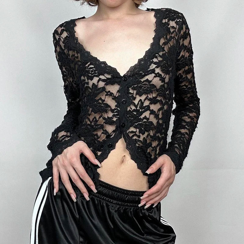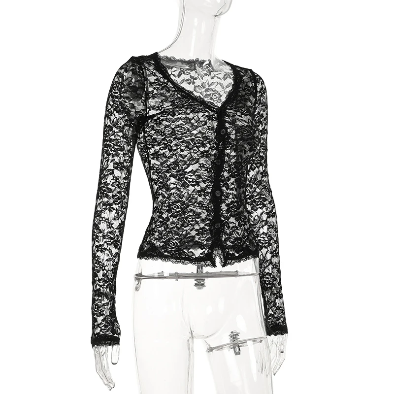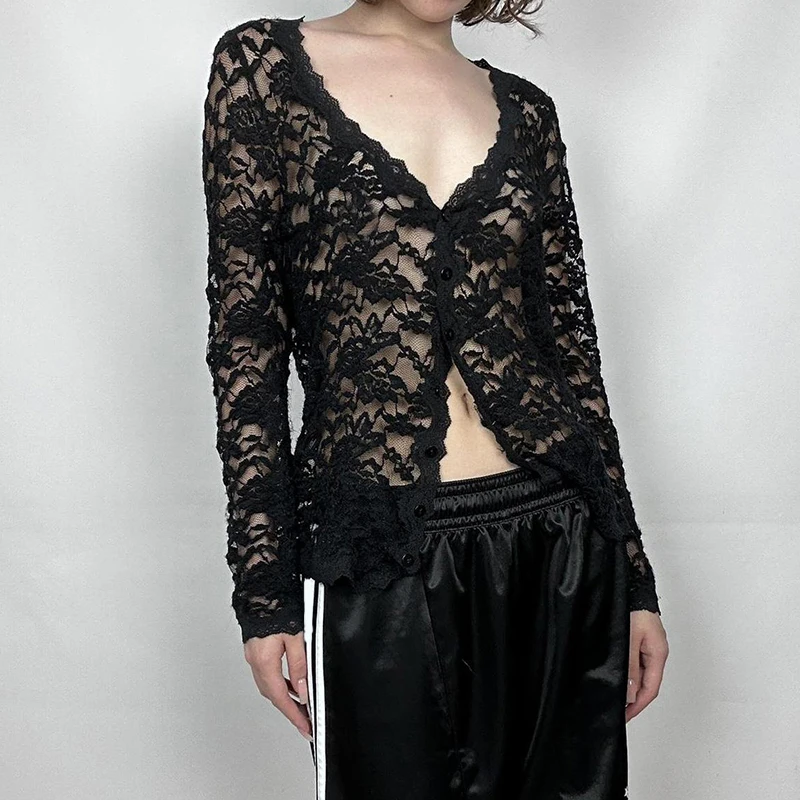 Hnewly Sexy Black Lace Crop Top Solid Transparent Button-up T-shirt Smock Women Full Sleeve V-neck Club Tees Shirts Y2k Vintage