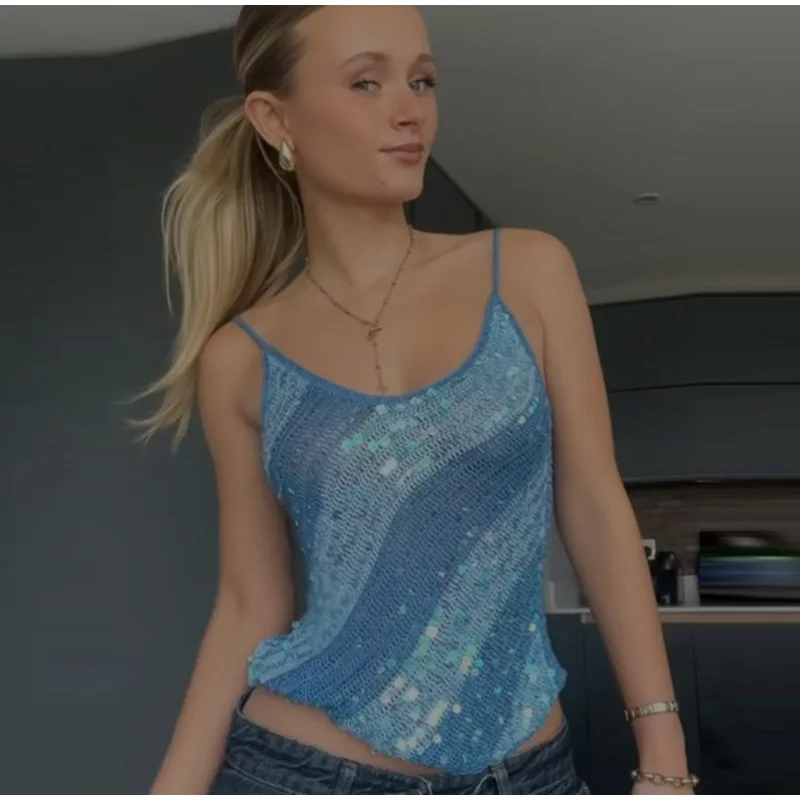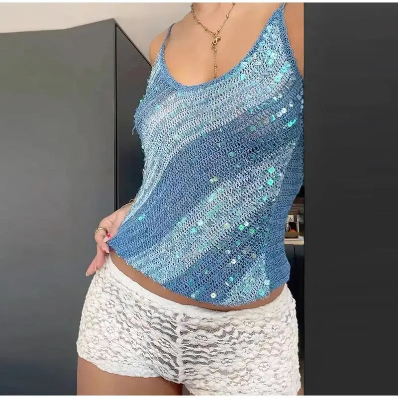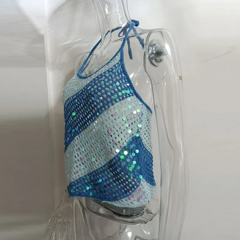Hnewly Sexy Knit Sequined Hollow Out Halter Tops Slim Patchwork Sleeveless Backless Female Vest Summer Lady Beach Y2k Shiny Tops