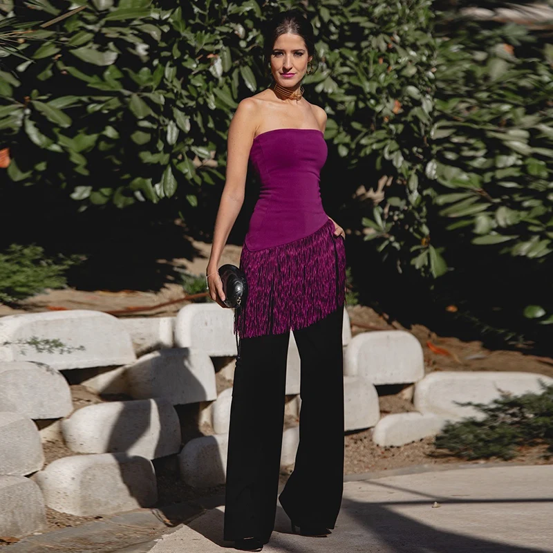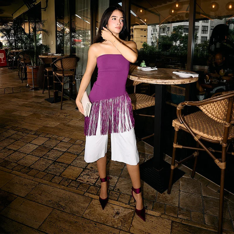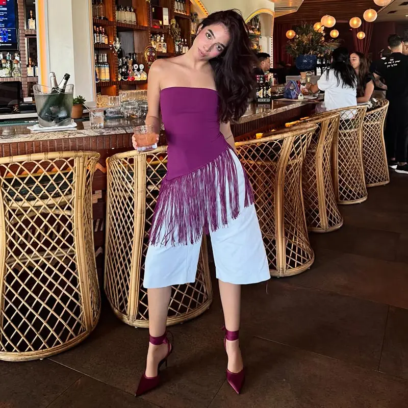 SHnewly Sexy Knit Tassels Patchwork Asymmetric Vests Slim Strapless Sleeveless Backless Tube Tops Spring Lady Beach Camisole