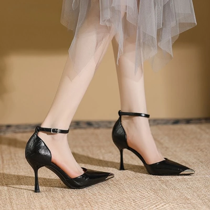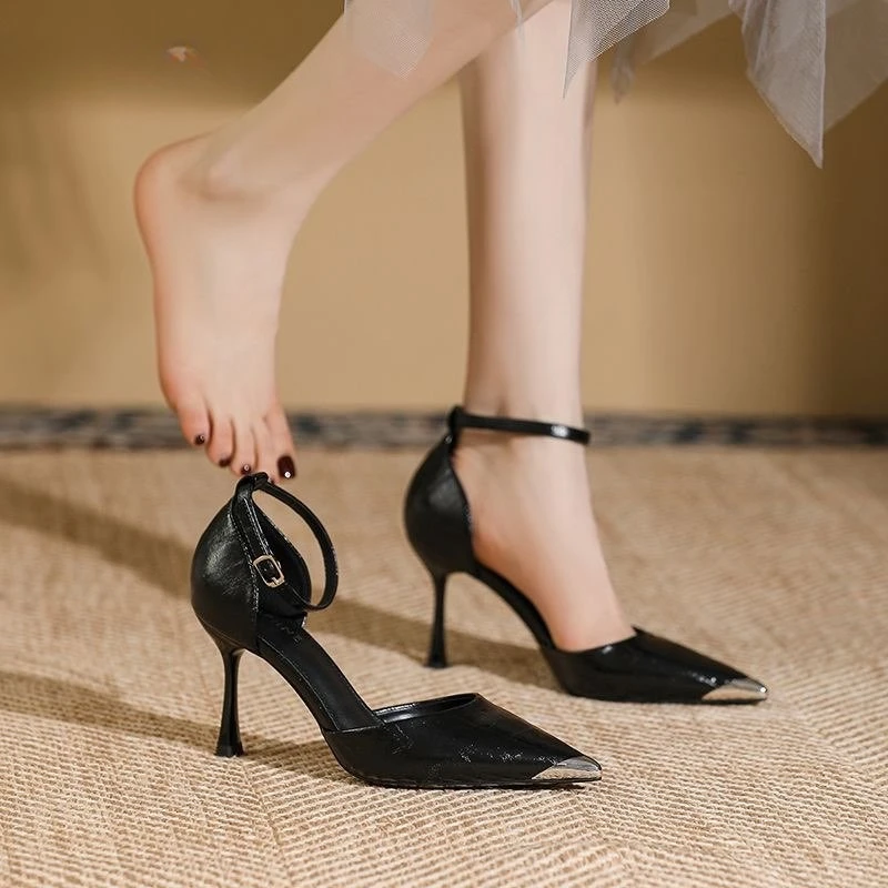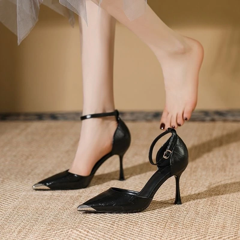 Hnewly Sexy Pointed Toe Shallow High Heels New One-line Strap Hollow Stipple Heel Baotou Sandals Women's Single Shoes