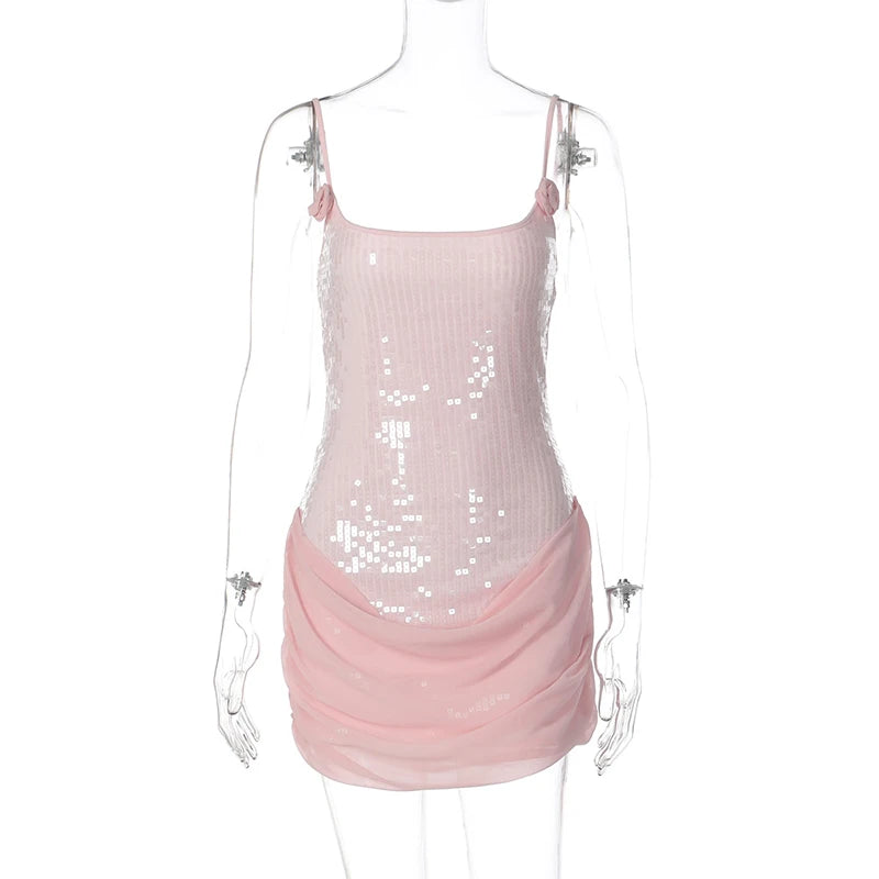 Hnewly Sexy Sequin Mesh Splice Short Dress Women Slim Square Neck Sleeveless Backless Dresses Autumn Lady Fashion Party Robes