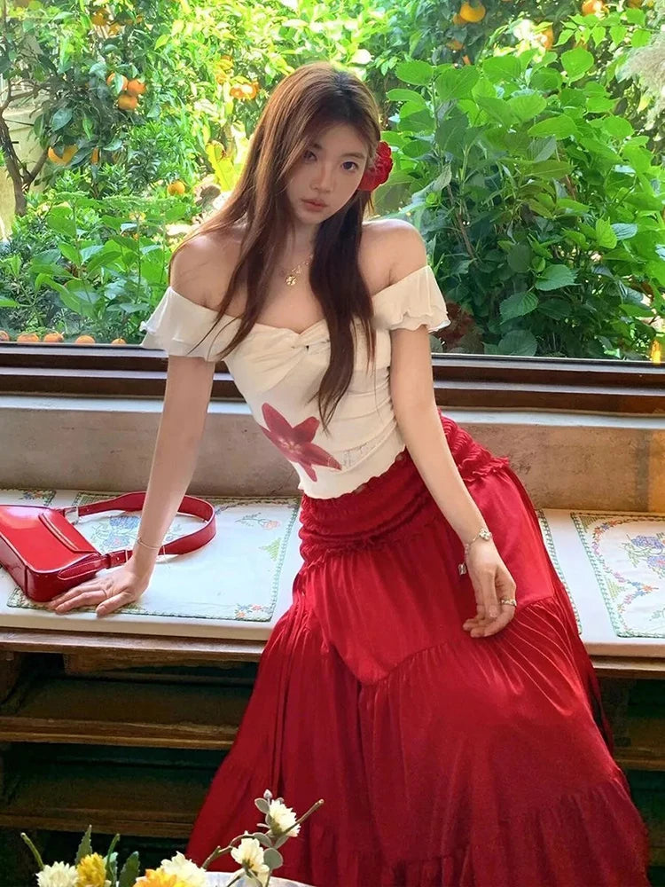 Hnewly Sexy Slash Neck Slim Tops 2 Piece Sets Y2K Femme Summer One Shoulder Tight Crop Tops High Waist Chic Patchwork A Line Skirt Suit
