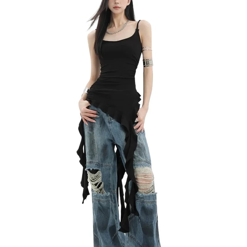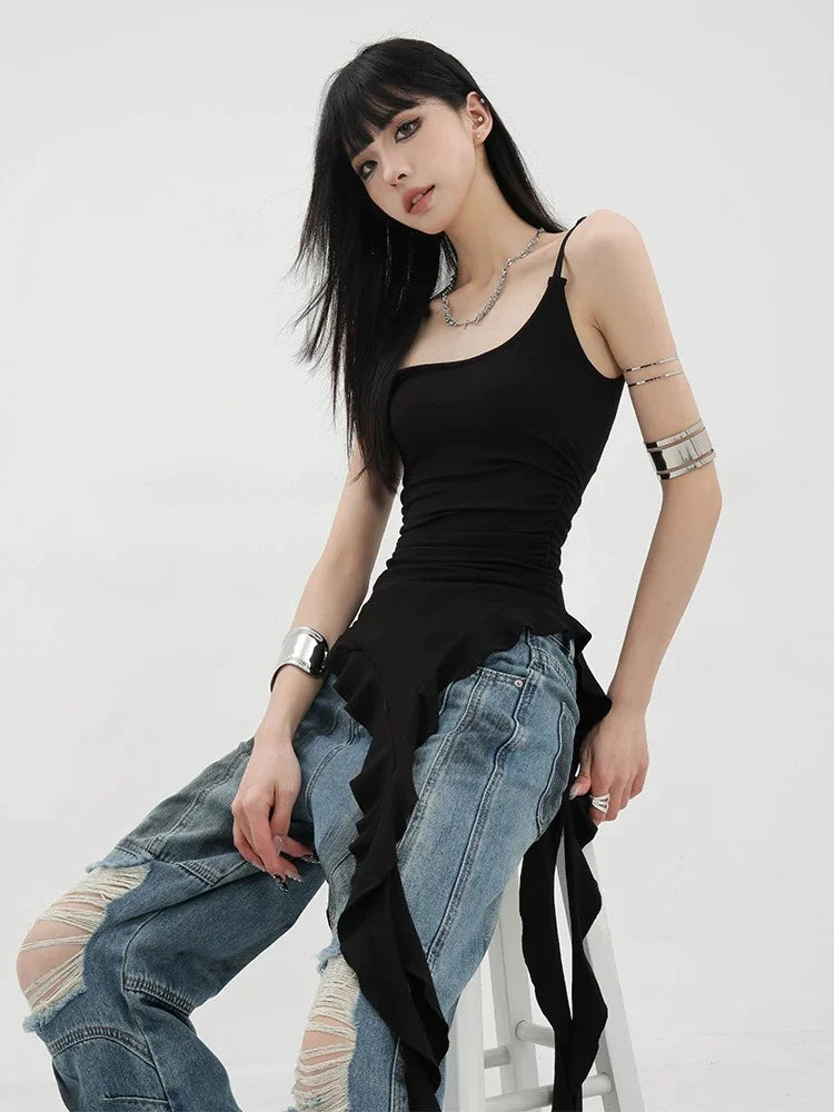 Hnewly Sexy Tank Top Asymmetrical Black Y2k Women Ruffle Grunge Backless Coquette Fashion Streetwear Tops Solid Aesthetics
