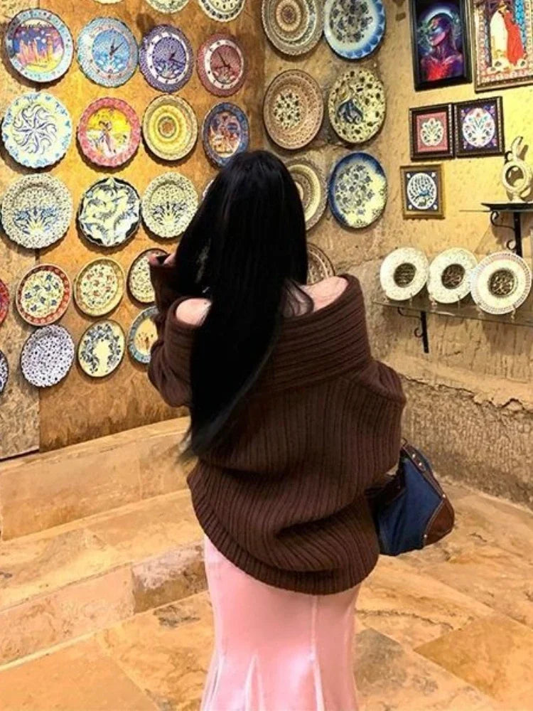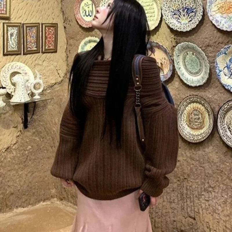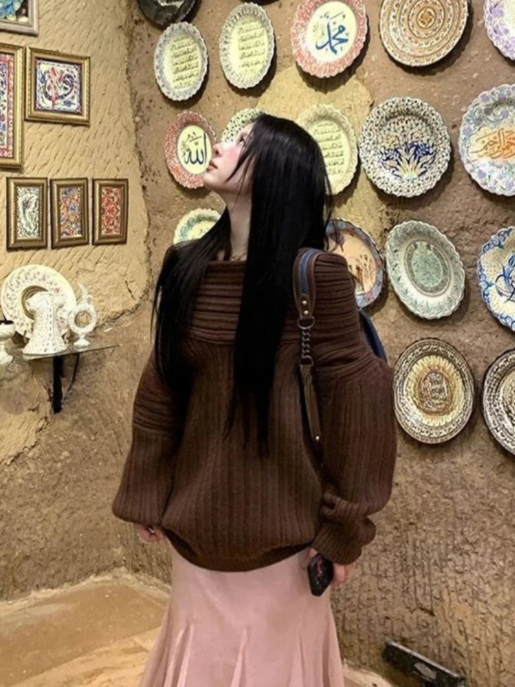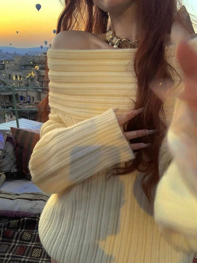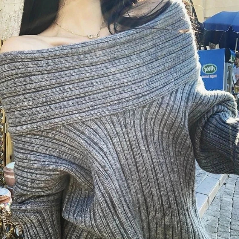 Hnewly Sexy Vintage Grey Sweaters Women Off Shoulder Korean Style Jumper Elegant Slash Neck Harajuku Long Sleeve Pullovers