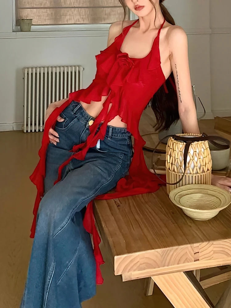 Hnewly Sexy Y2k Vintage Thin Strape Ruffle Halter Crop Top Women Backless Basic Sleeveless T shirt Off shoulder Club Party Lady Tees