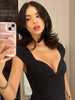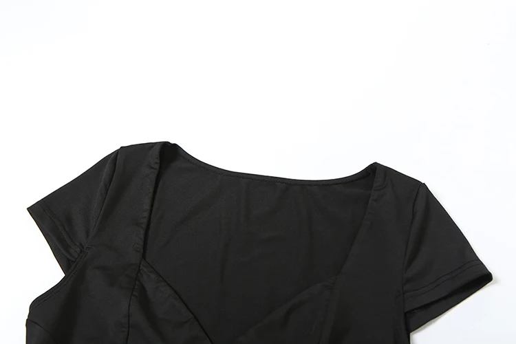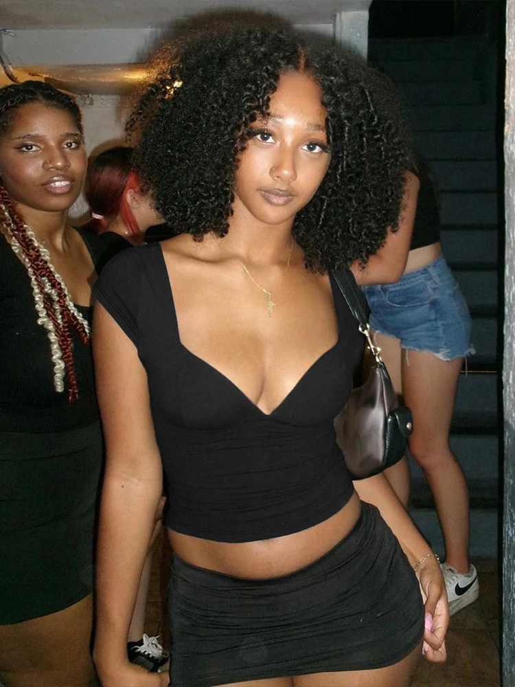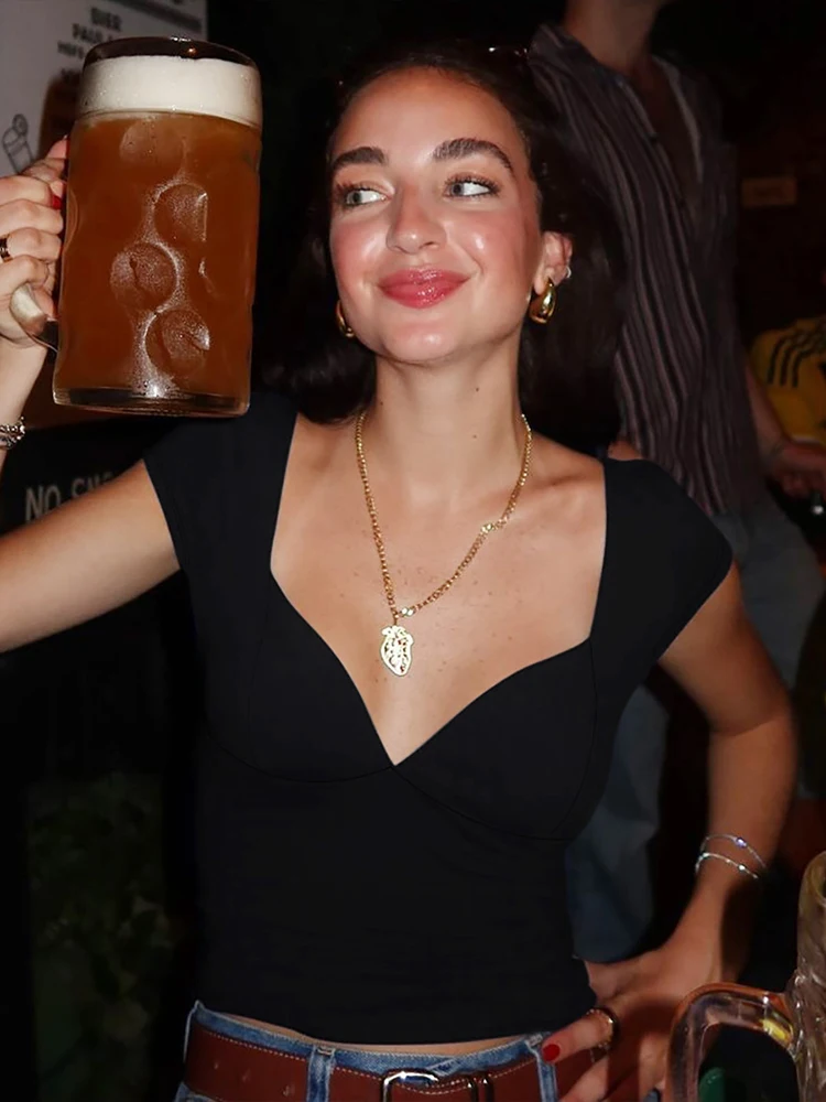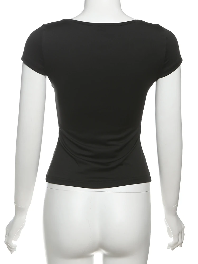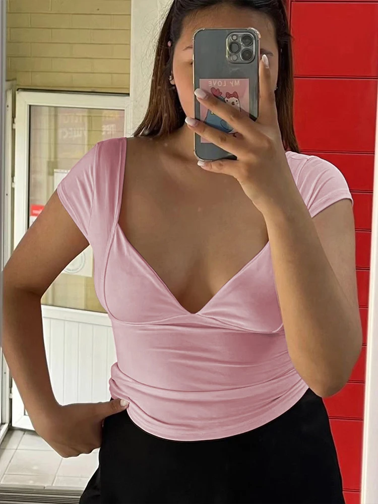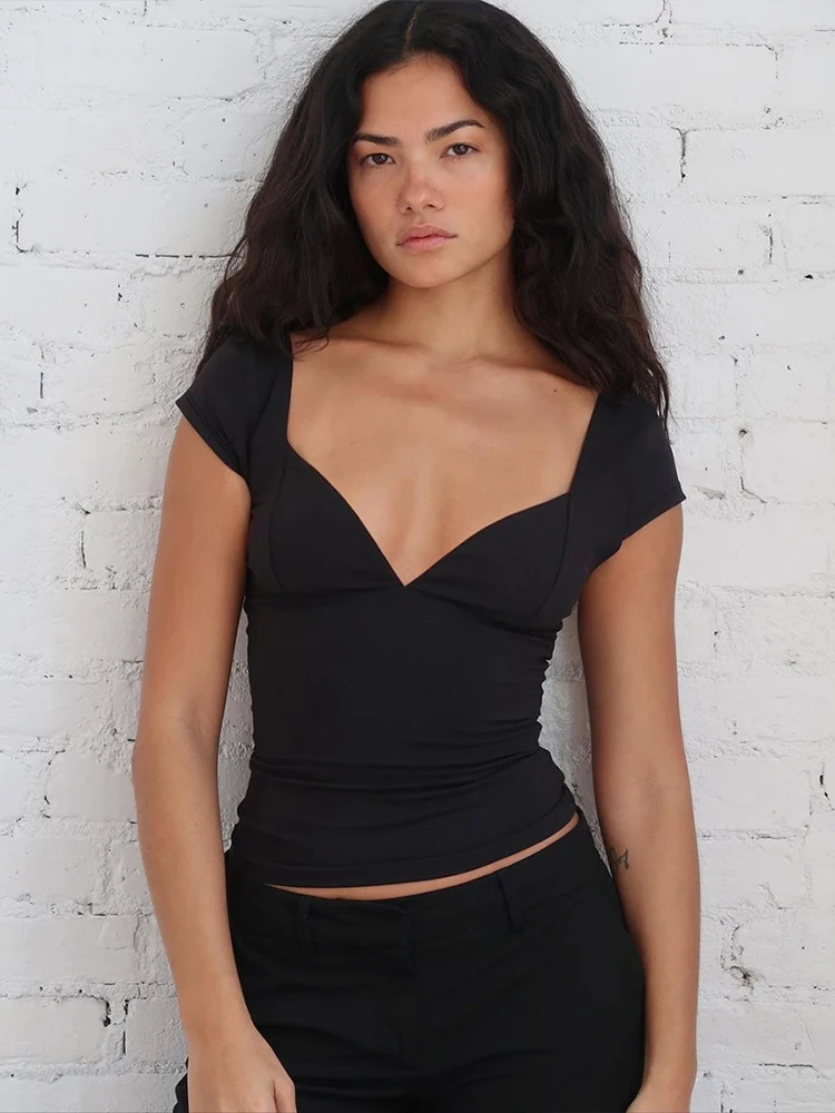 Hnewly Simple Crop Tops Women Deep V-Neck Snap Sleeve 2025 Summer Daily New Trend Solid Classic Basic Street Commute T-Shirt