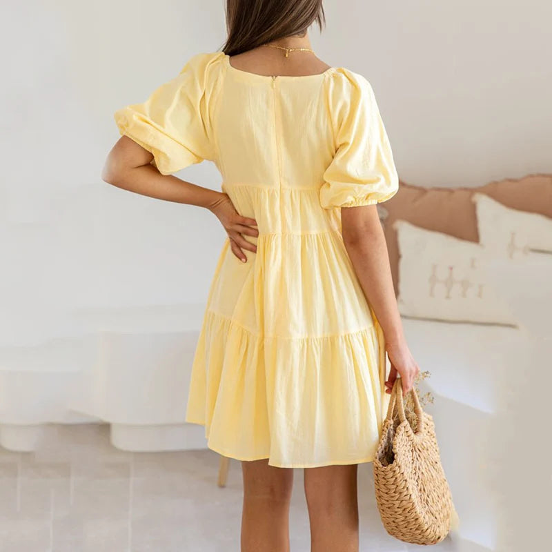 Hnewly Solid Color V Neck Loose Dress for Women Summer Beach Vacation A Line Dresses Woman Puff Sleeve Pregnants Maternity Dresses