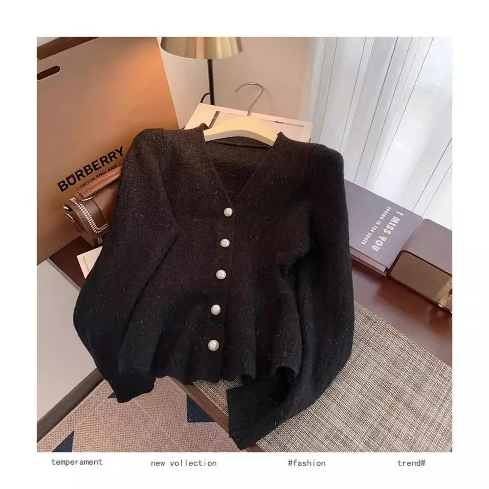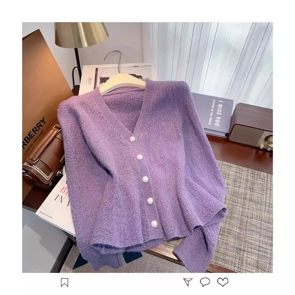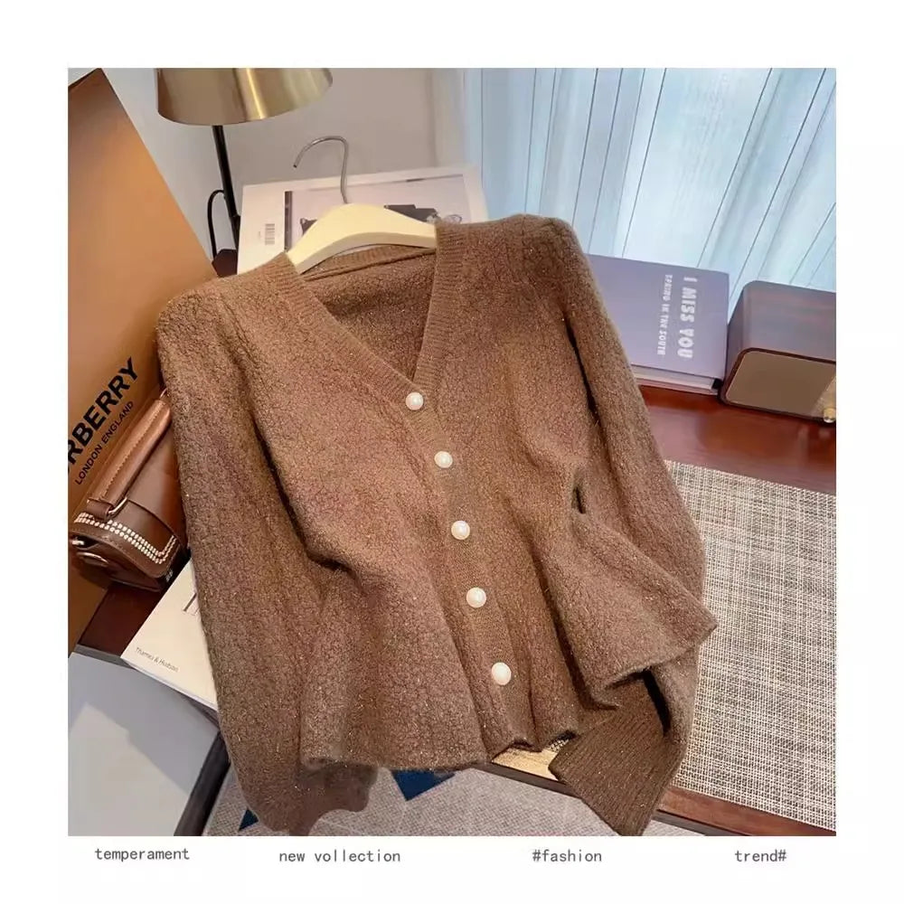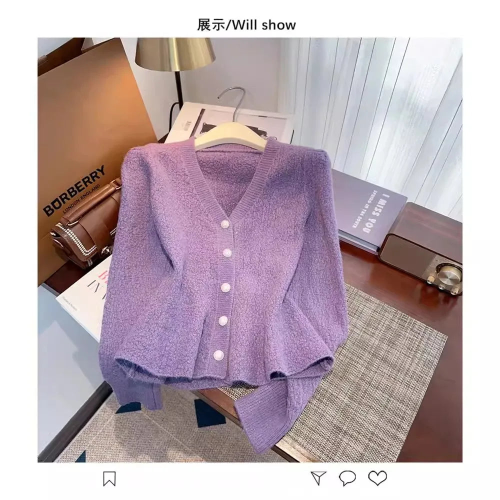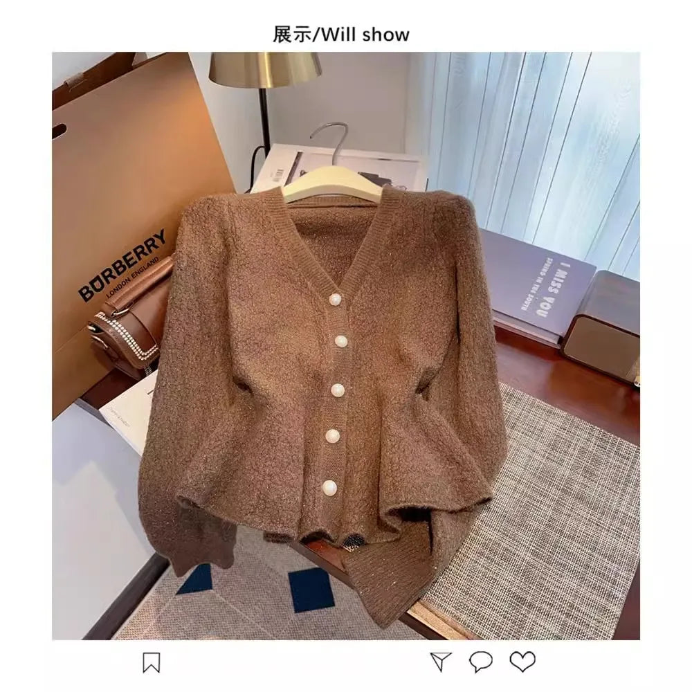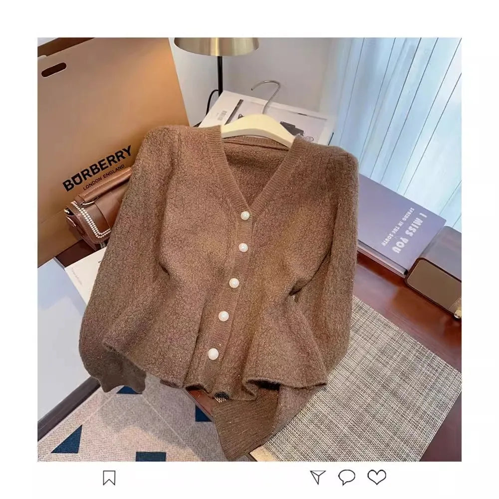 Hnewly Solid V-neck Cardigan Sweater Women Autumn/Winter French Style Puff sleeve Coat Hold The Waist Fishtail knitted Short Top