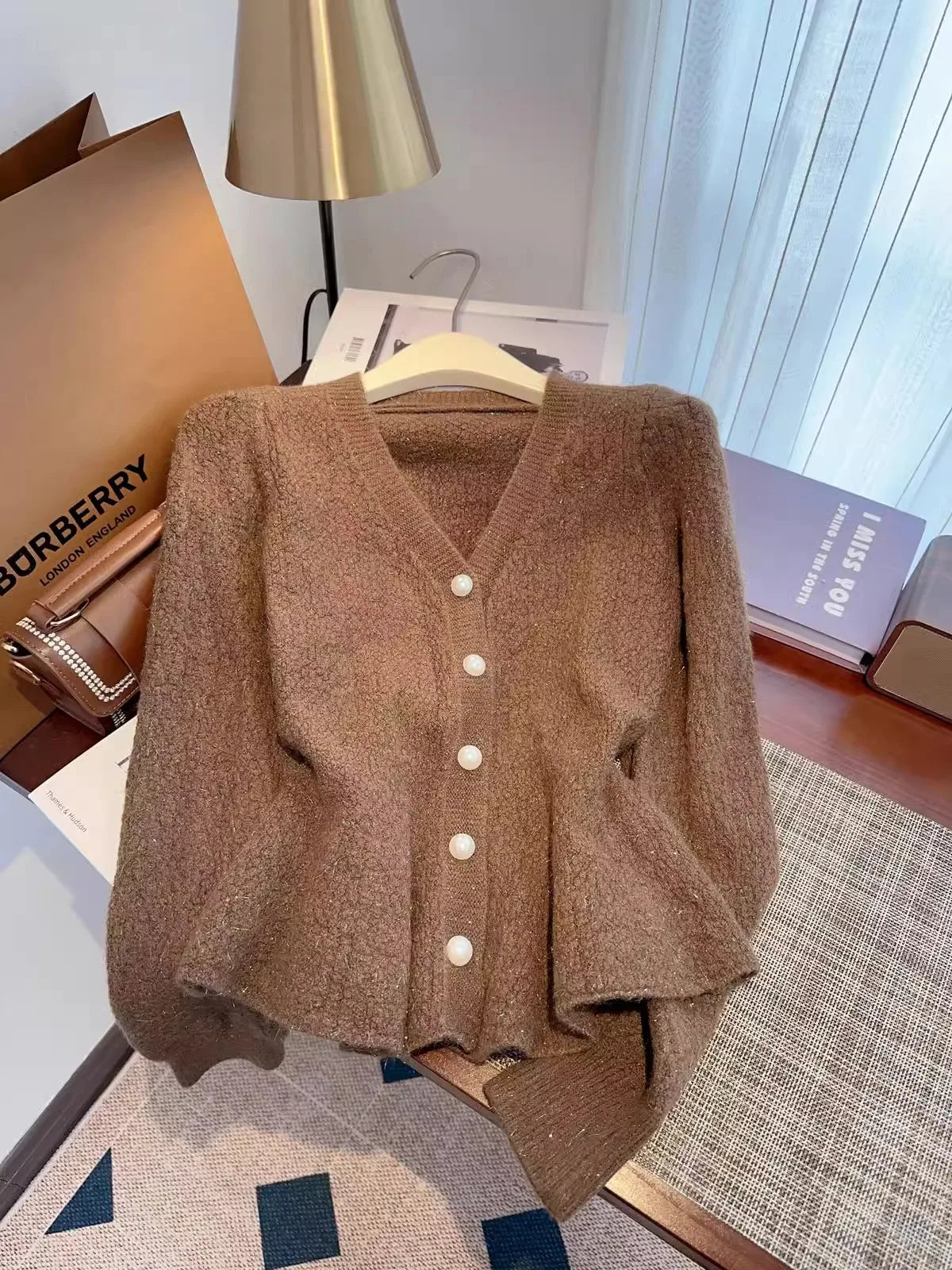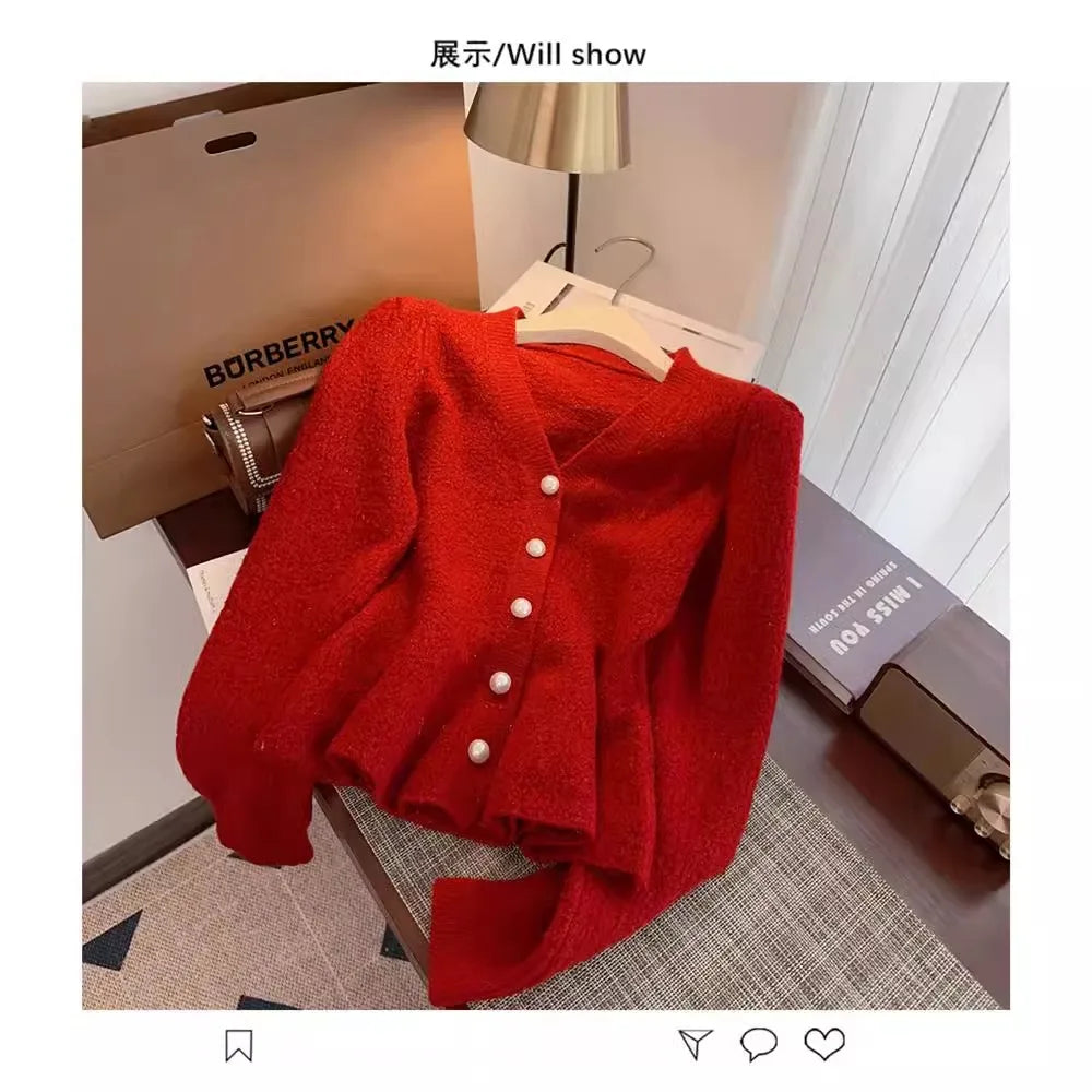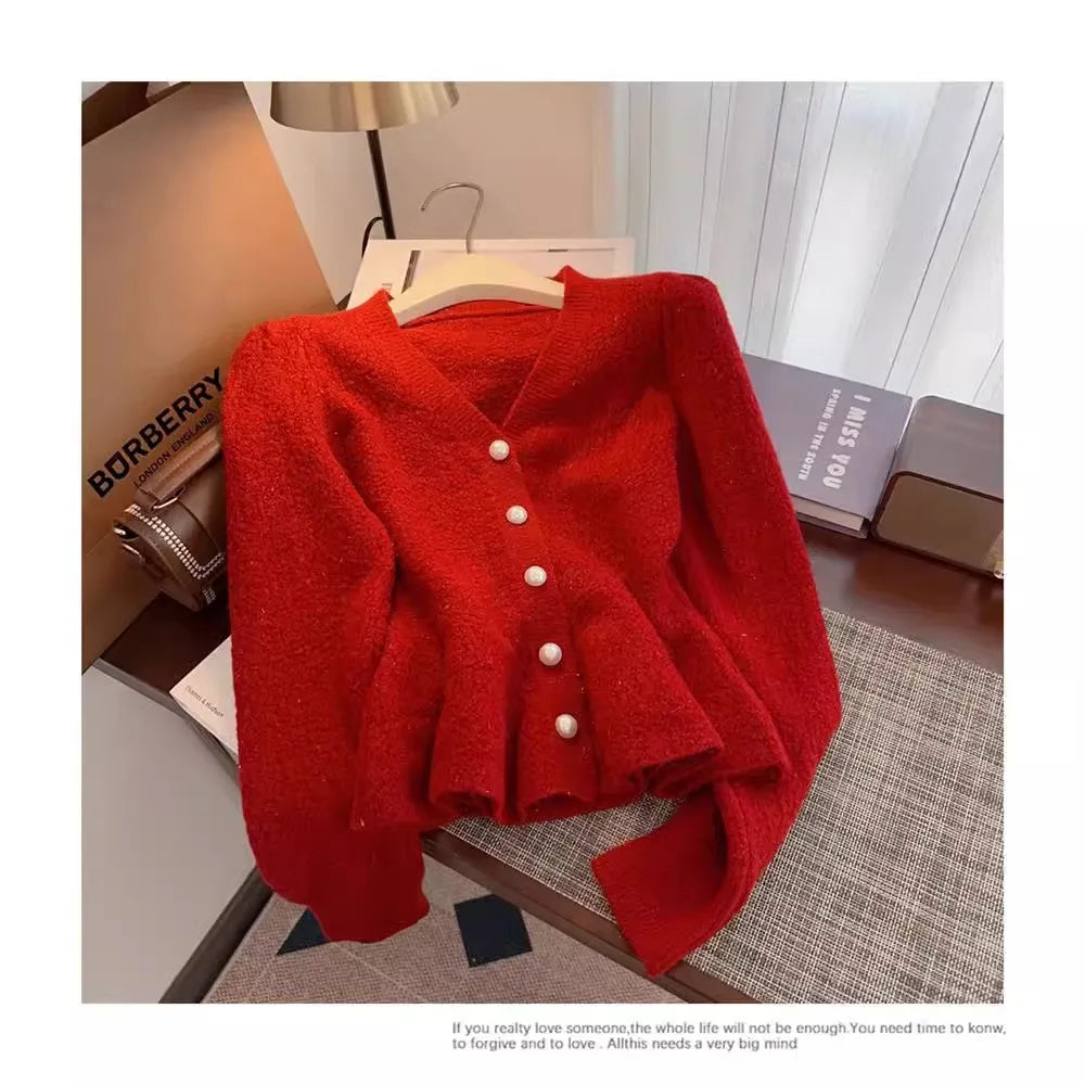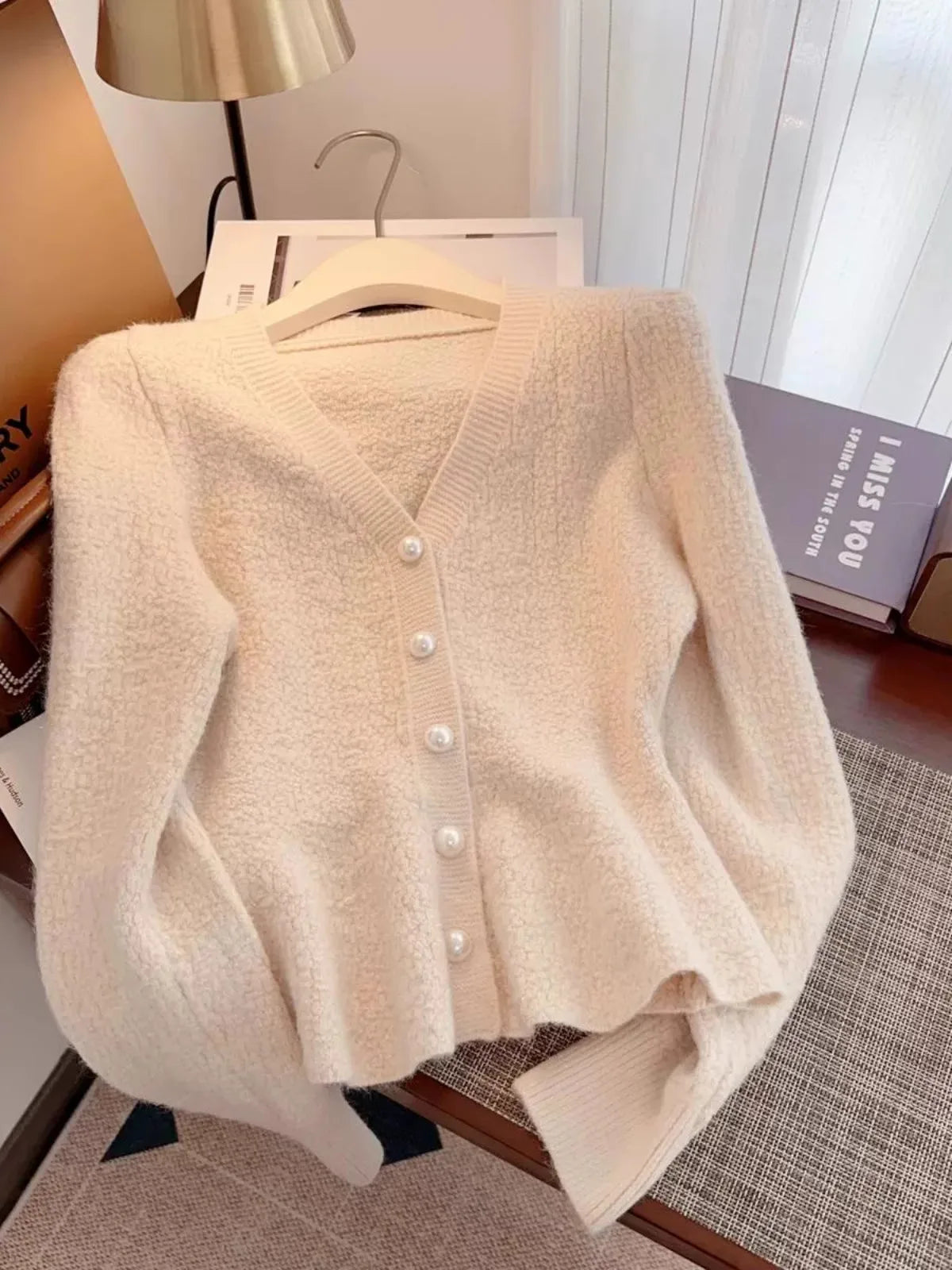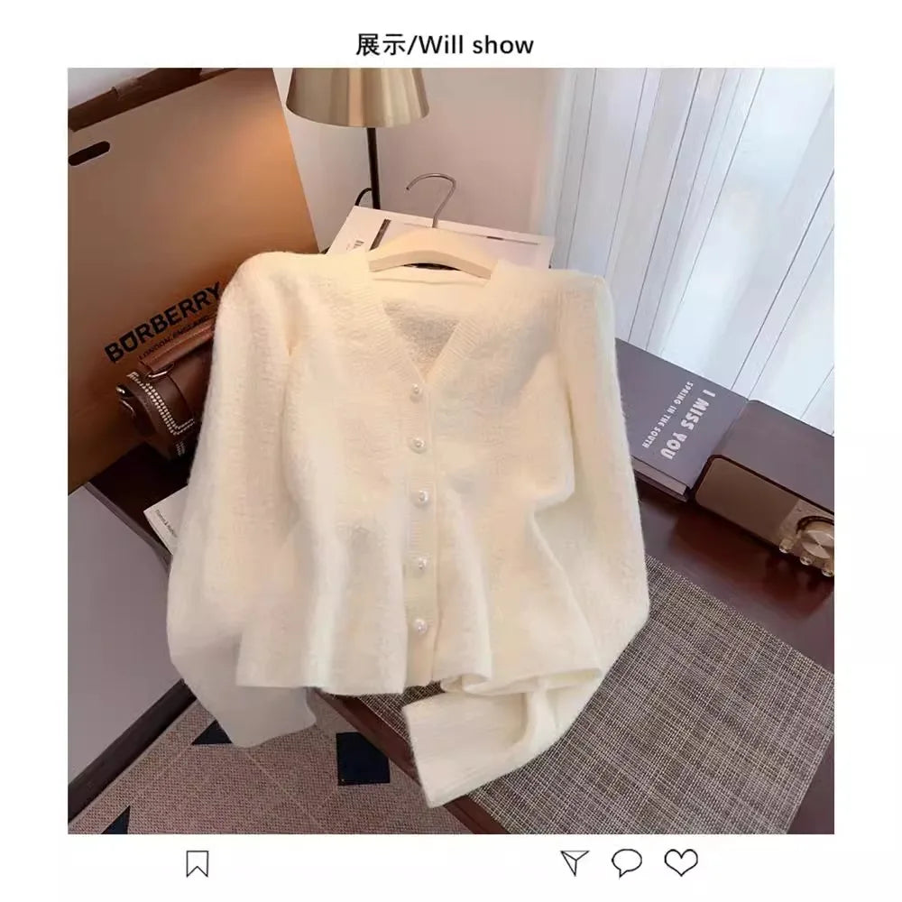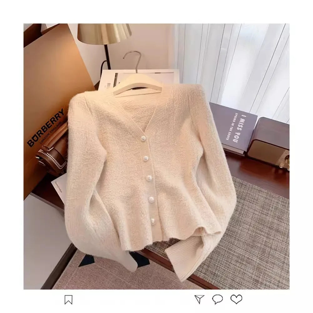 Hnewly Solid V-neck Cardigan Sweater Women Autumn/Winter French Style Puff sleeve Coat Hold The Waist Fishtail knitted Short Top