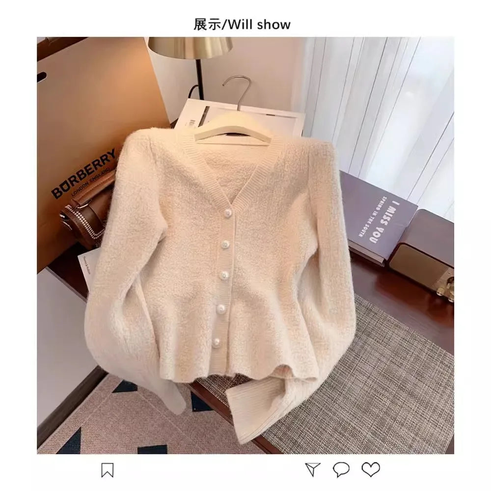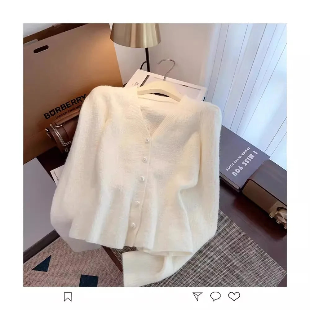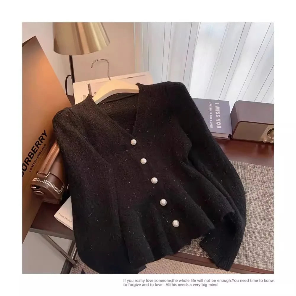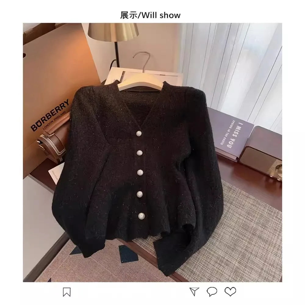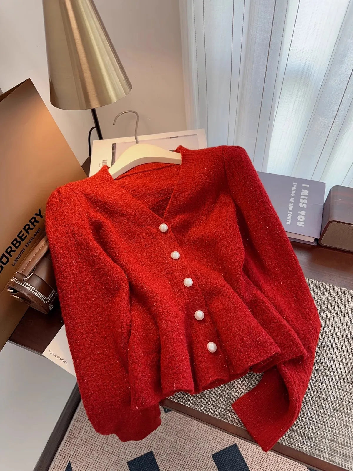Hnewly Solid V-neck Cardigan Sweater Women Autumn/Winter French Style Puff sleeve Coat Hold The Waist Fishtail knitted Short Top