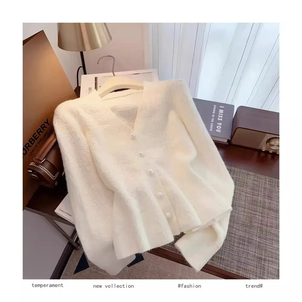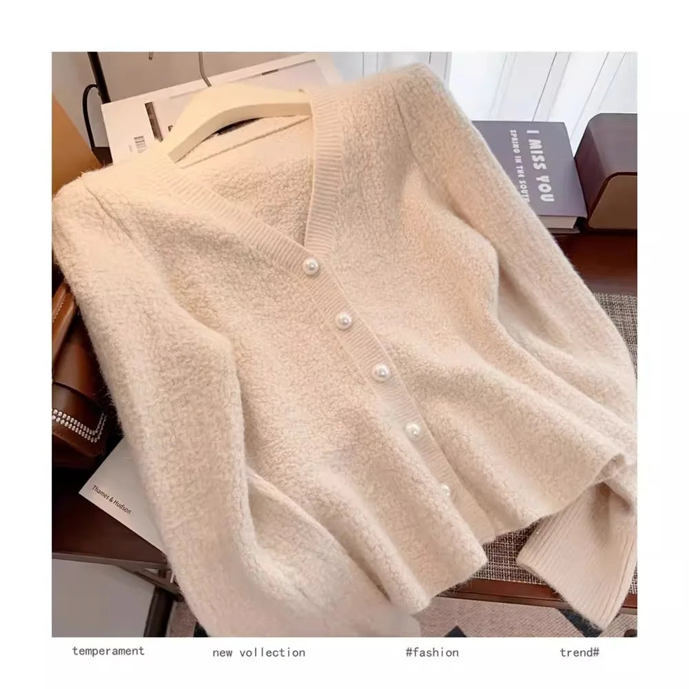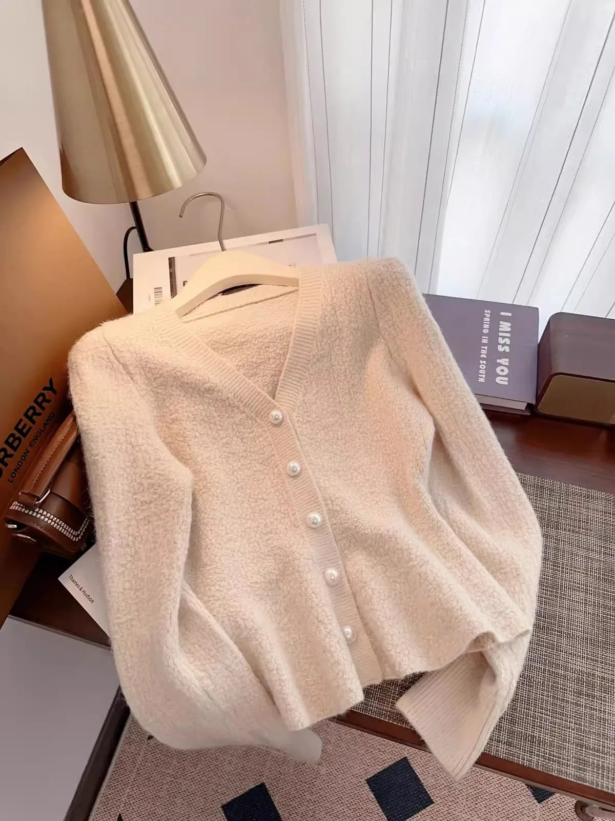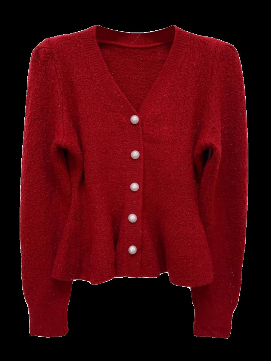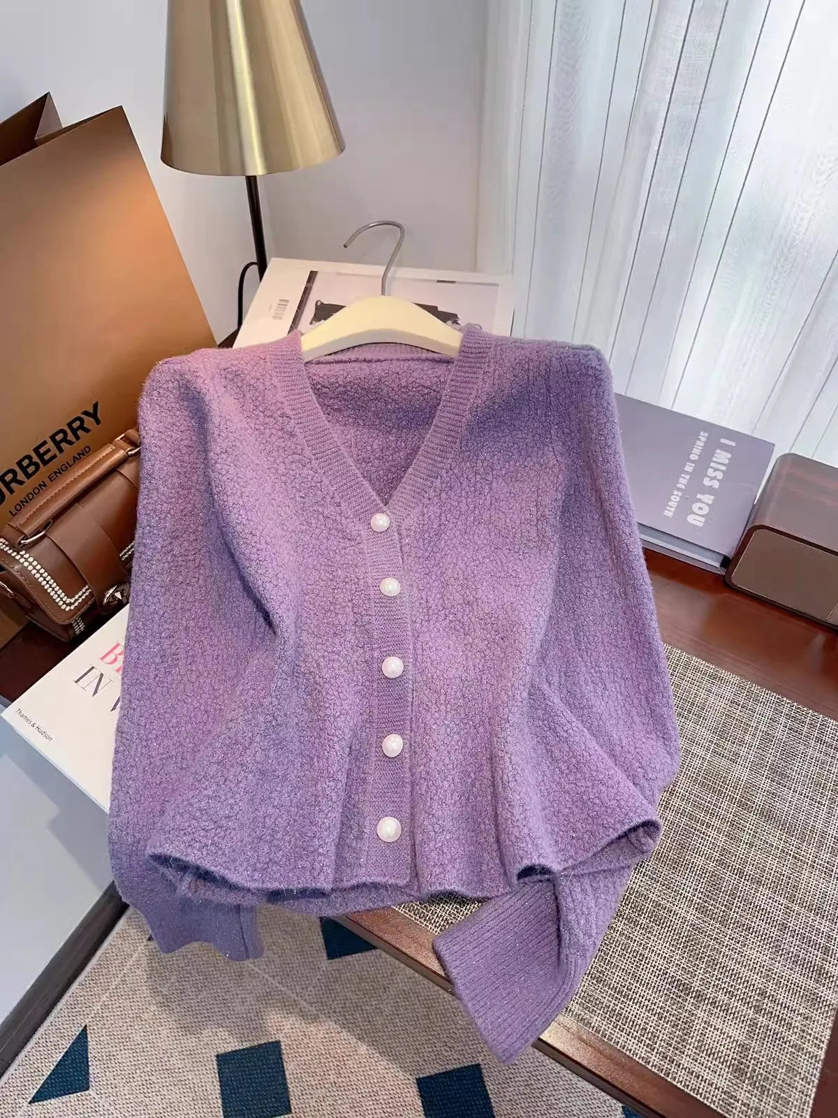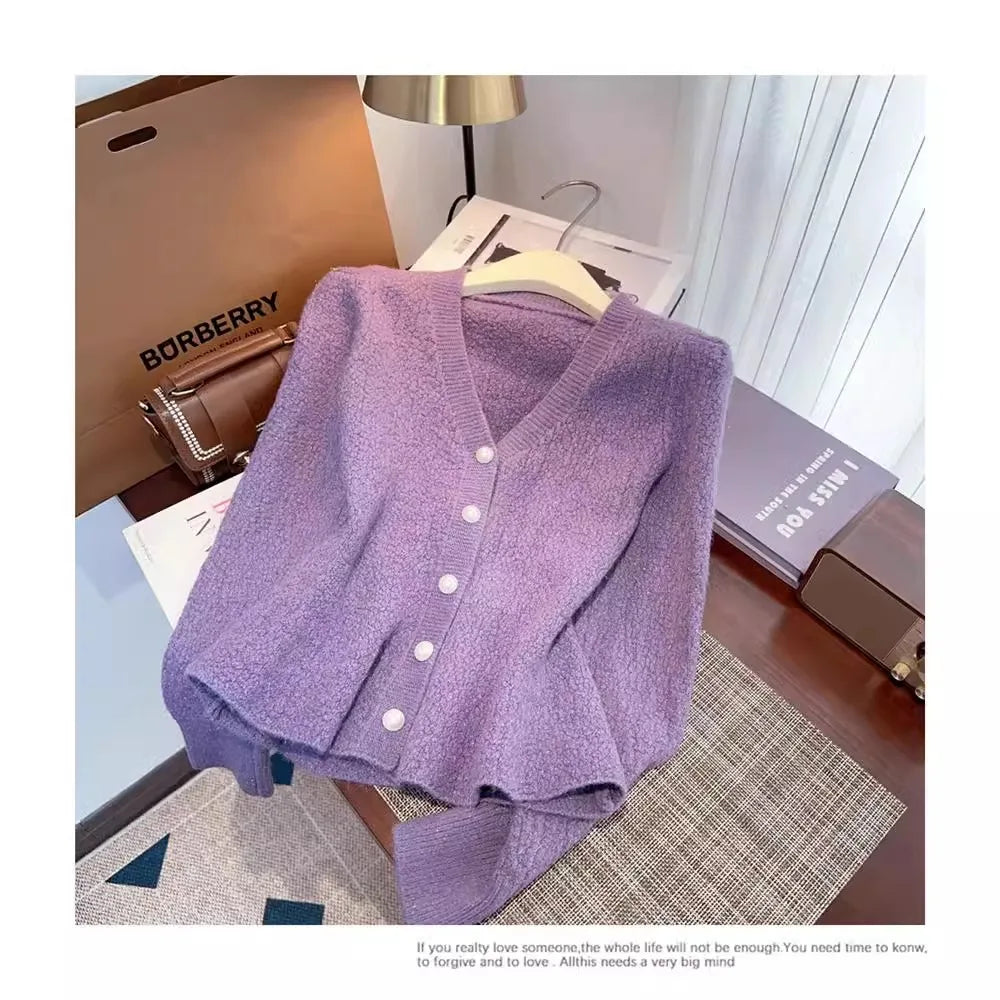 Hnewly Solid V-neck Cardigan Sweater Women Autumn/Winter French Style Puff sleeve Coat Hold The Waist Fishtail knitted Short Top