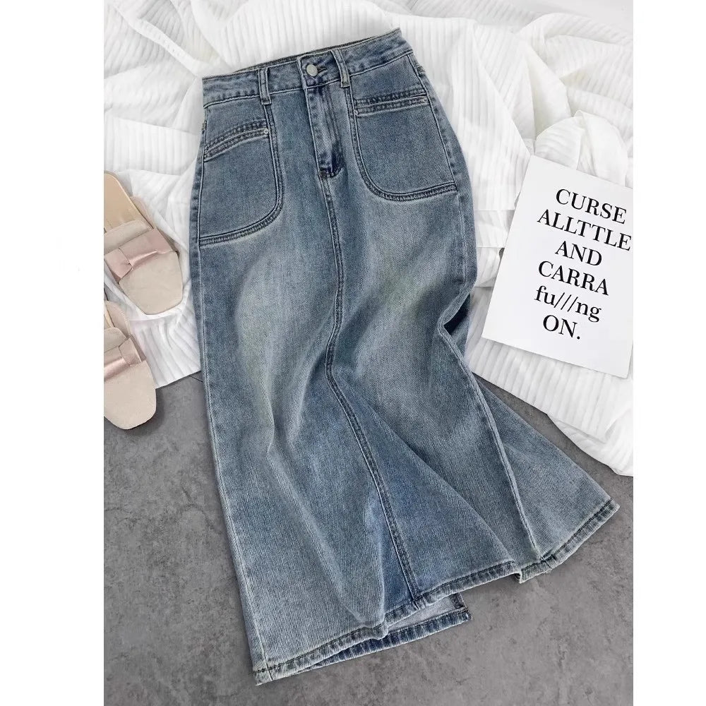 Hnewly Split High Waisted Denim Skirt Versatile Mid Length Jeans Skirt Women Autumn Light Color Fashionable Double Pocket Skirt