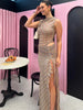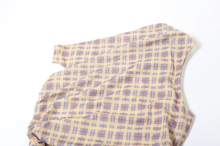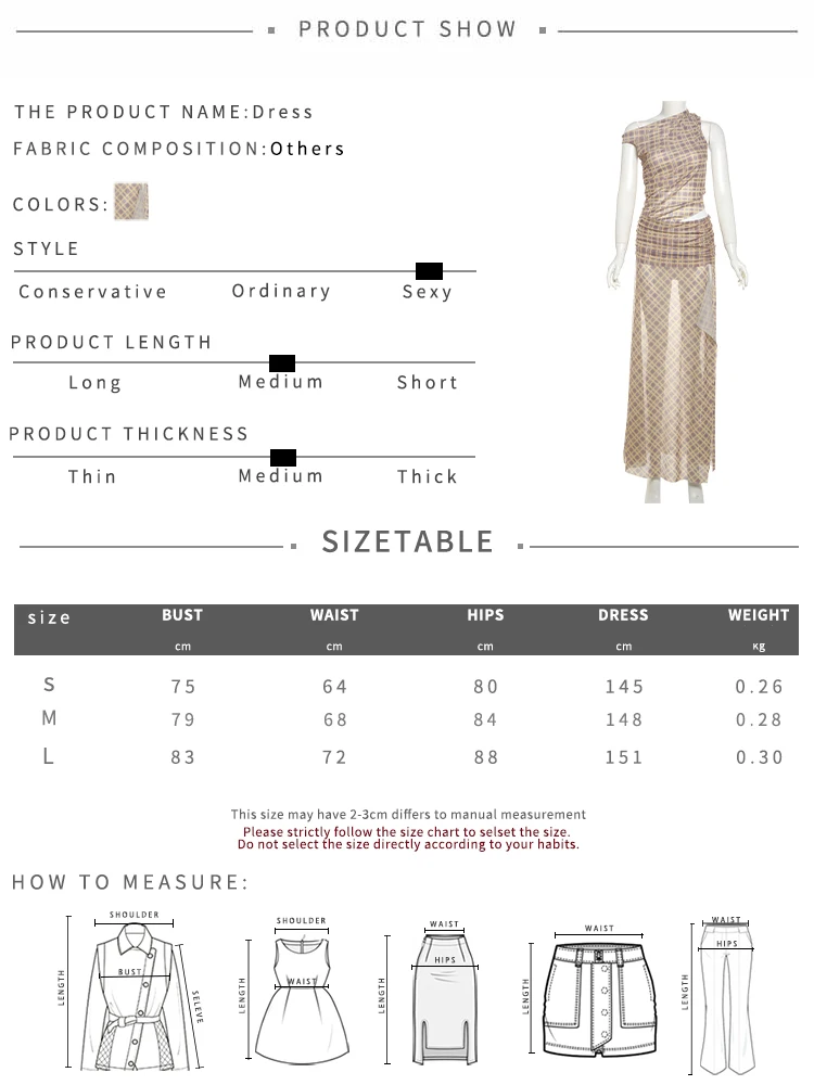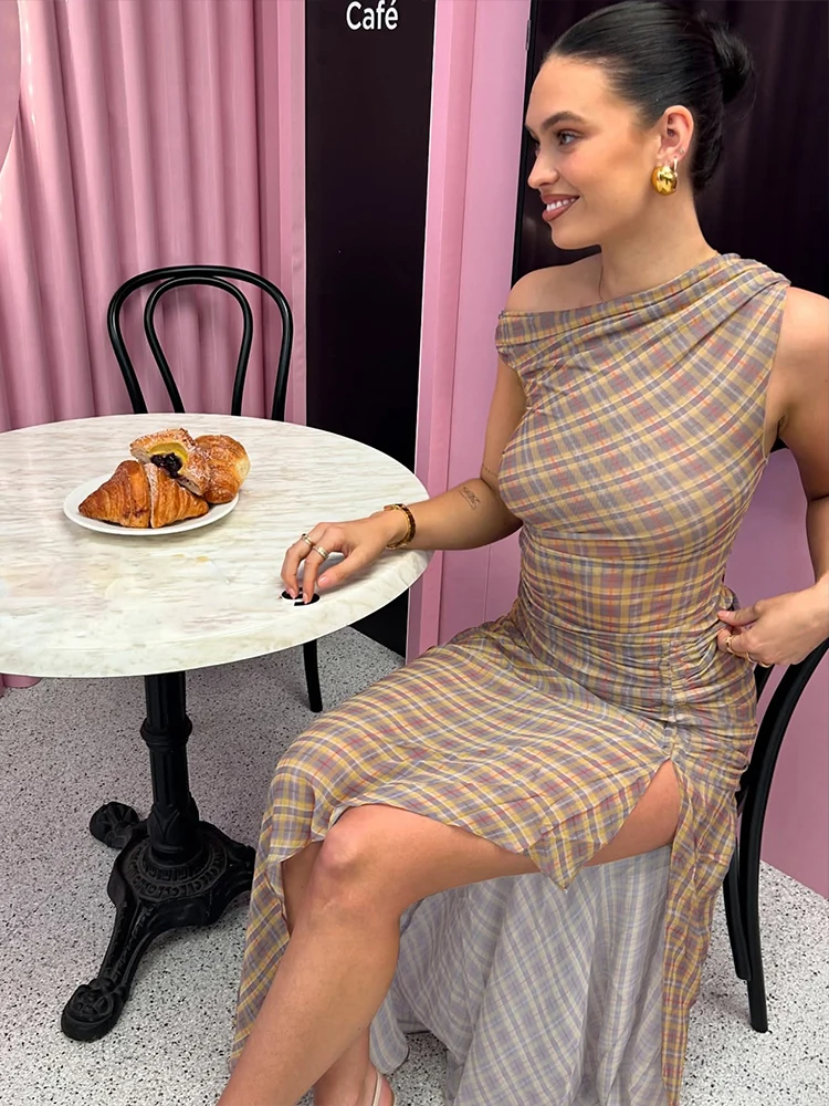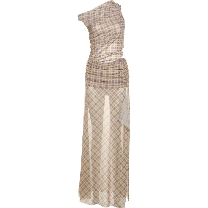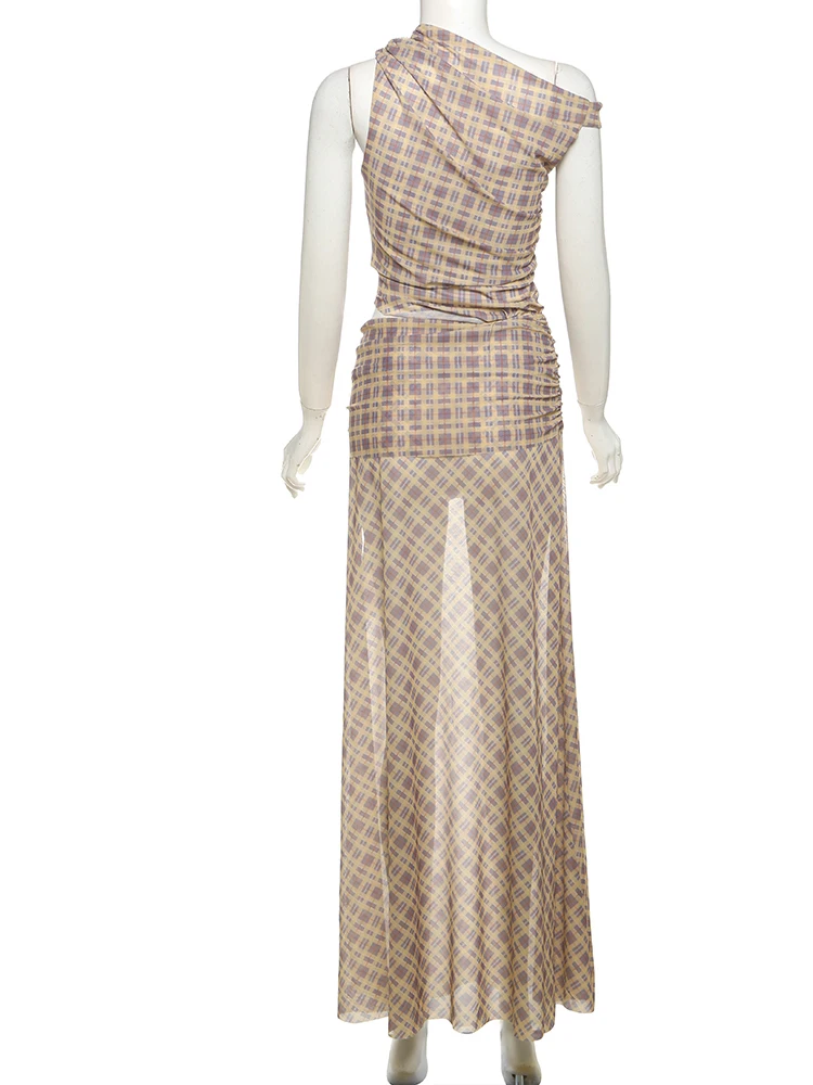 Hnewly Split Summer Dress Women See Through Y2K Plaid Print Inclined Shoulde Waistless Split Irregular Ruched Maxi Bodycon