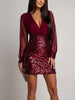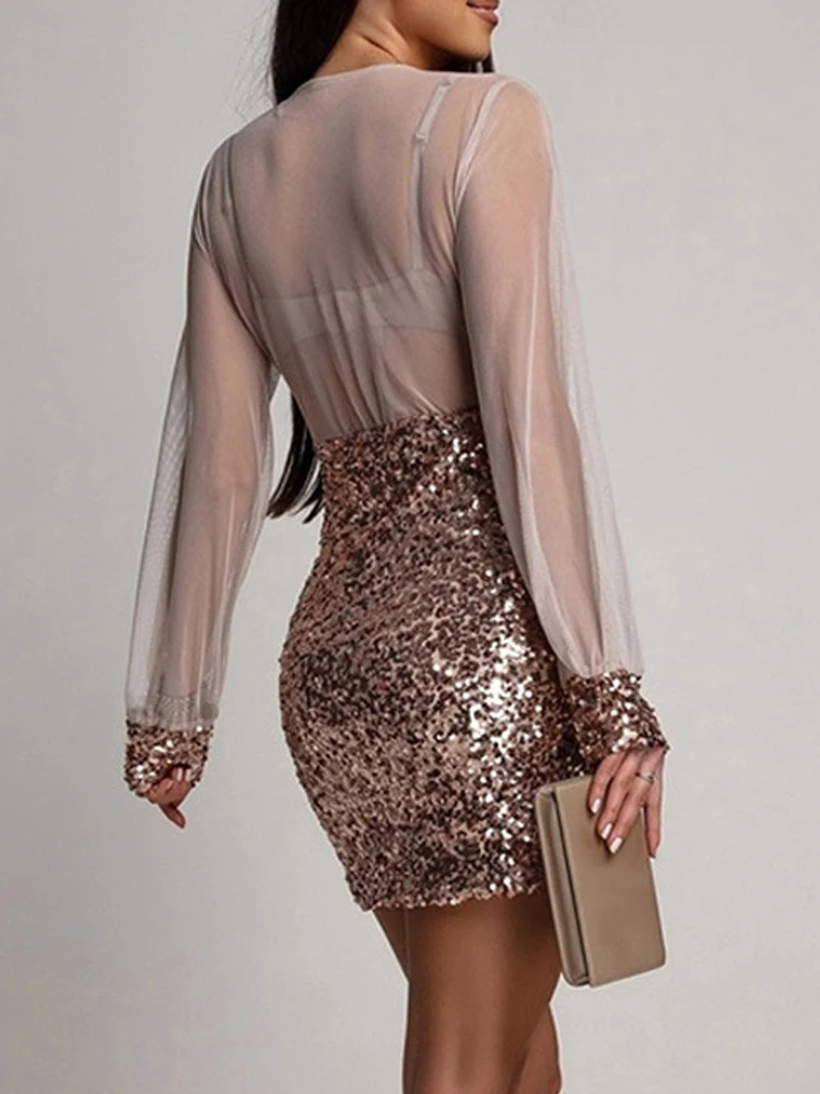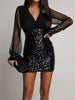 Hnewly Spring Fashion Slim Fit Office Dress Sequin Patchwork V-neck High Waisted Party Dress Sexy Slim Fit Mesh Long Sleeved Dress