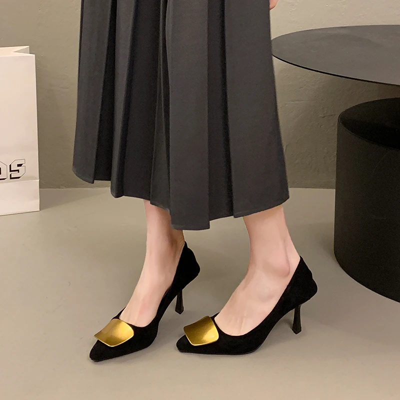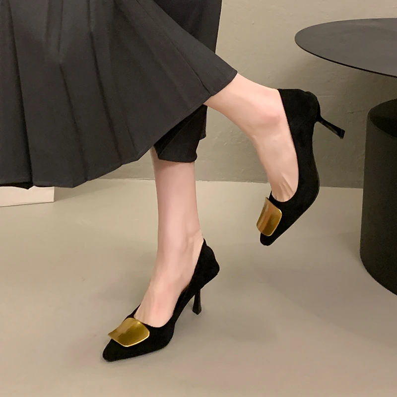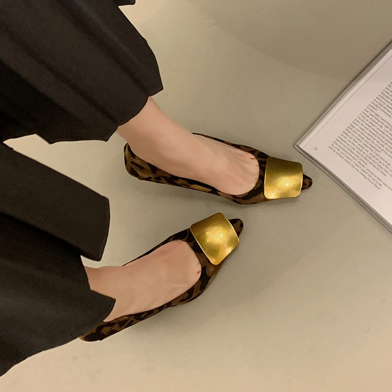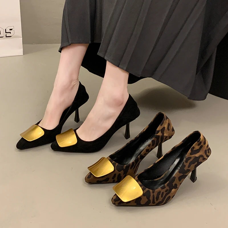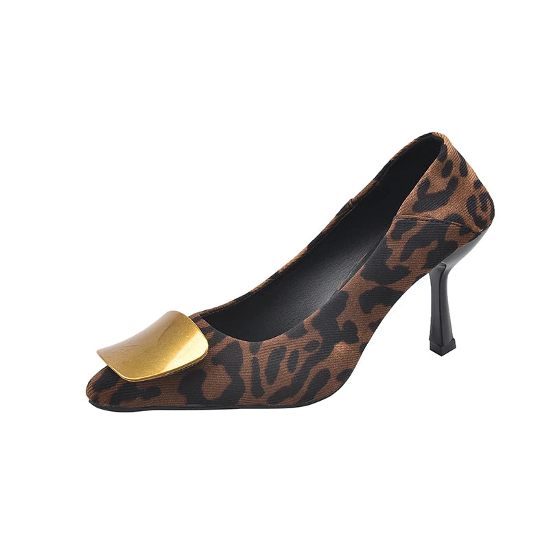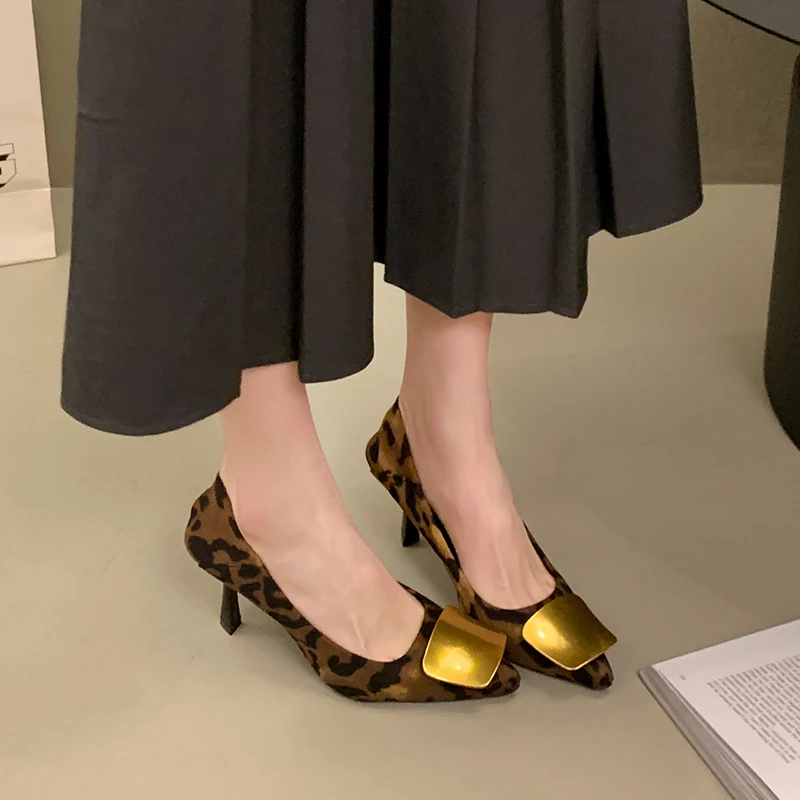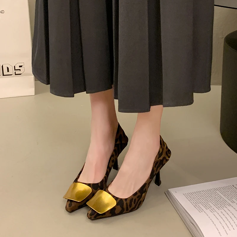 Hnewly Spring Metal Decoration Women high heels Pumps Shoes Ladies Leopard Print Slip On Leather Eelgant Pointed Toe Party Dress Shoes