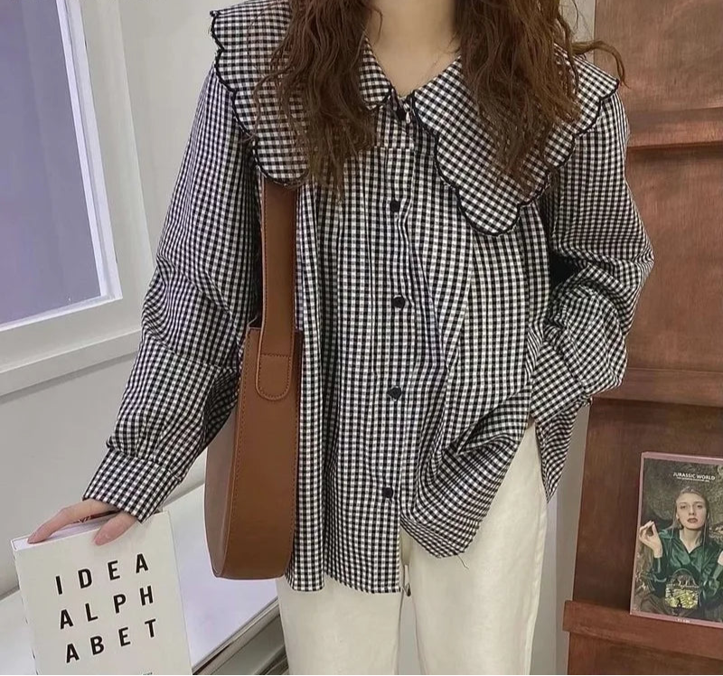Hnewly Spring Shirt Womens Lovely Elegant Soft Student Simple Plaid All-match Chic Tops Peter-pan-collar Fashion Vintage New Clothing