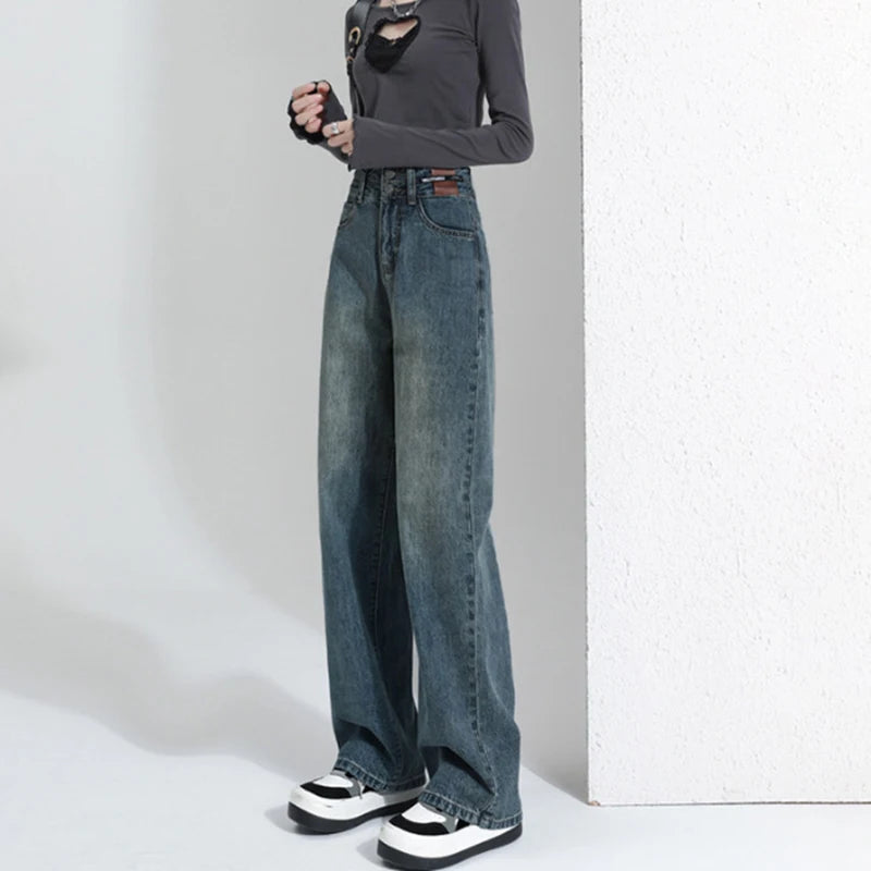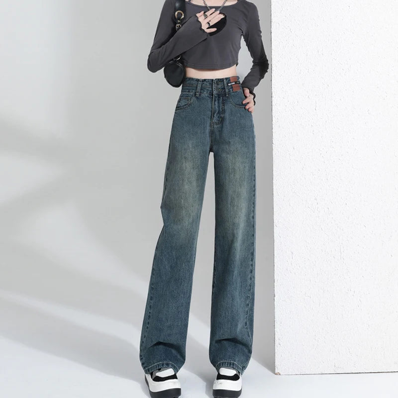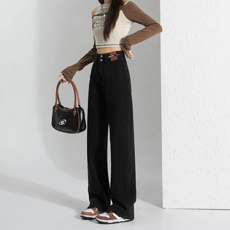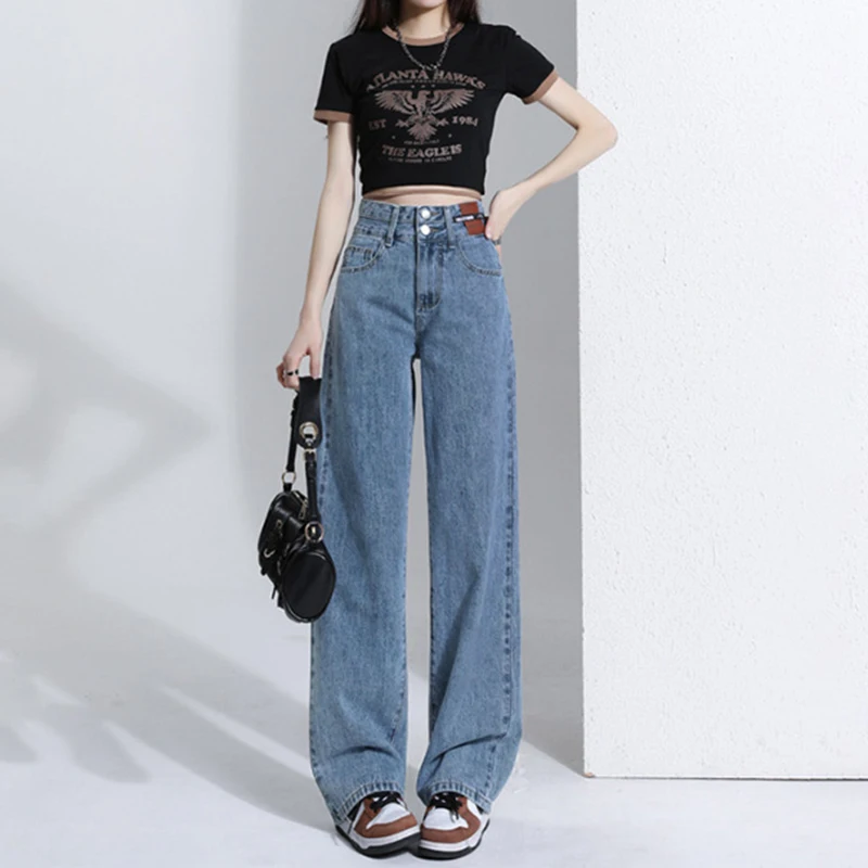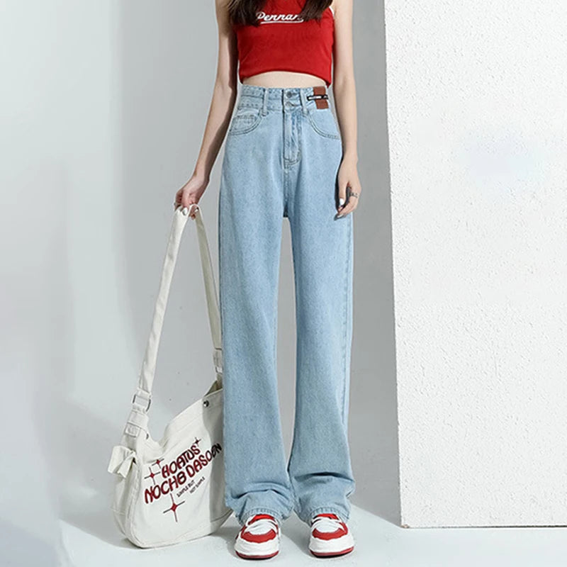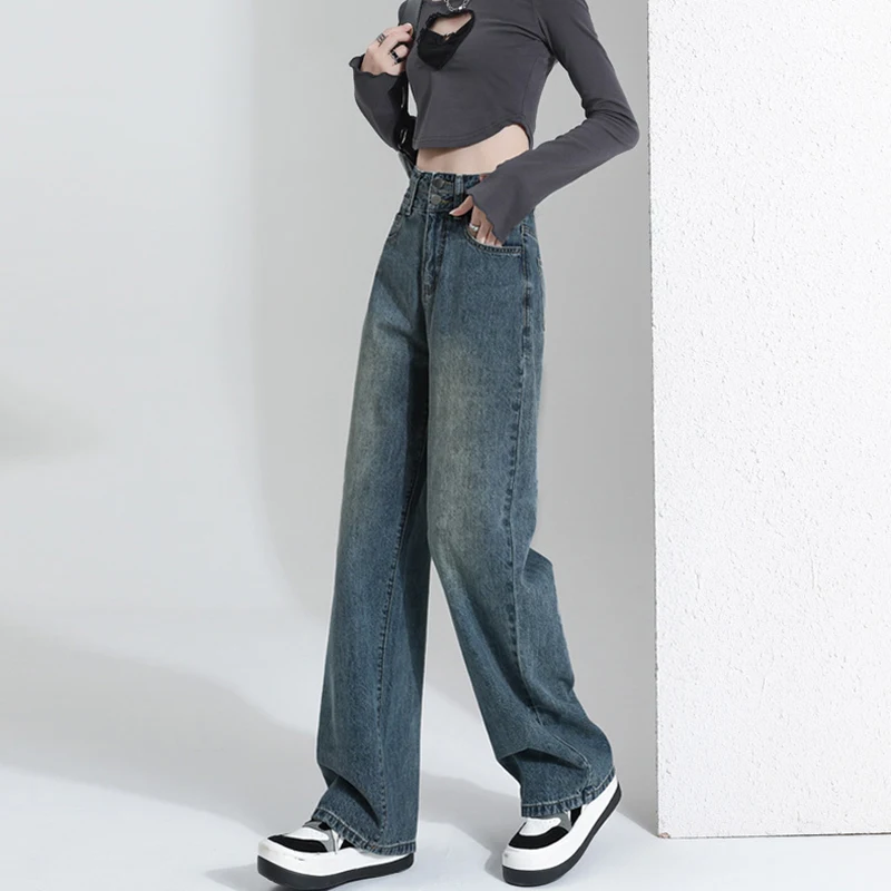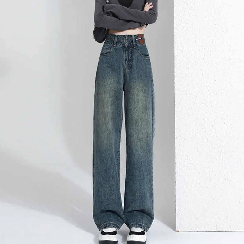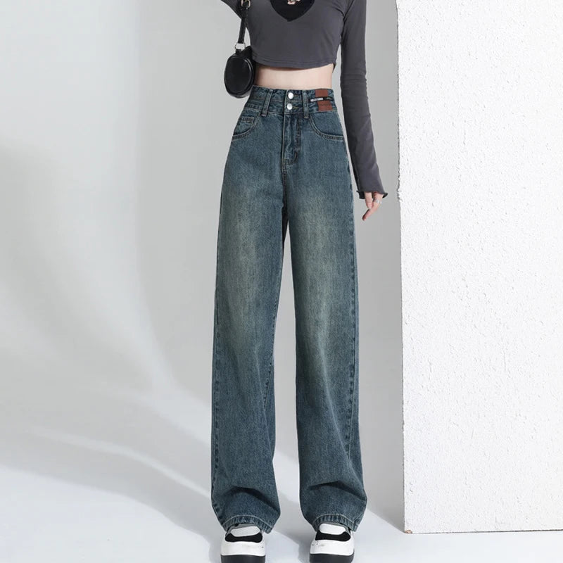 Hnewly Spring Vinatge High Waist Straight Jeans Women Korean Double Buttons Wide Leg Denim Pants Woman Classic Baggy Jeans Trousers