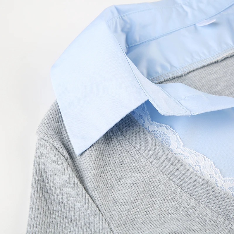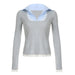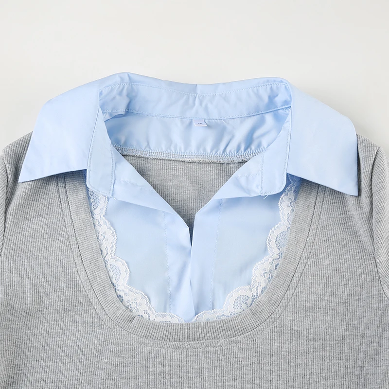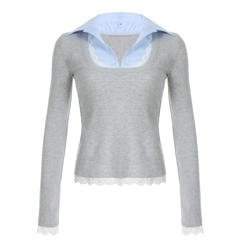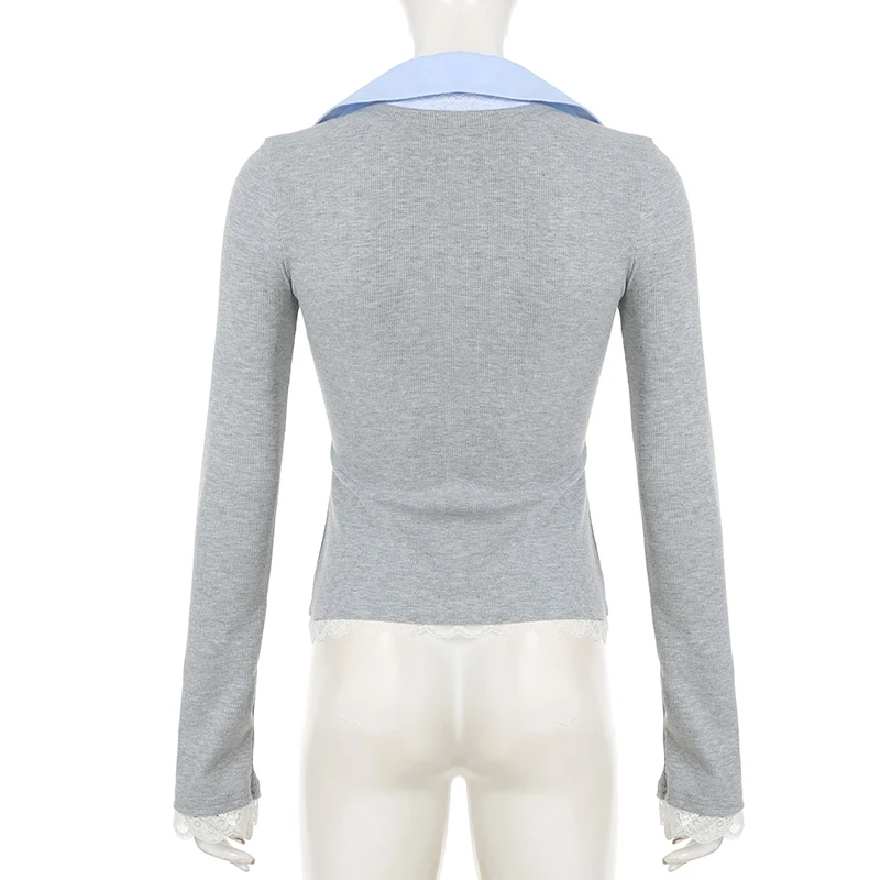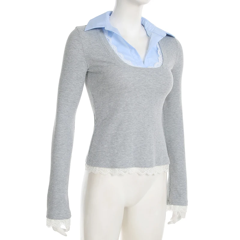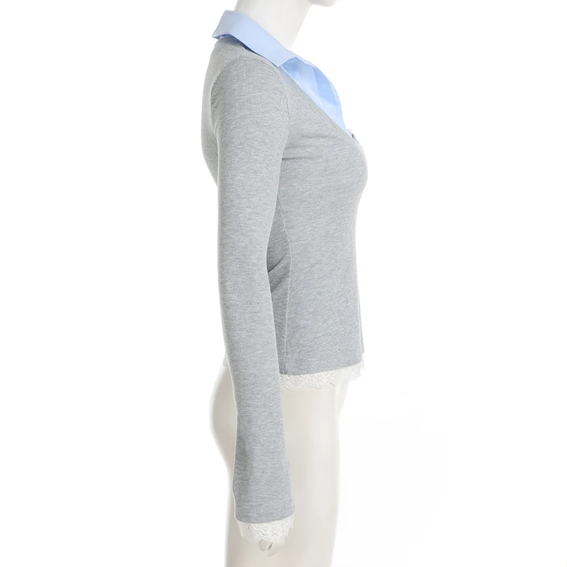 Hnewly Stitching Slim-fitting Knit Crop Top Women Full Sleeve Turn-down Neck Skinny T-shirts y2k Casual Shirts Korean Style Tees