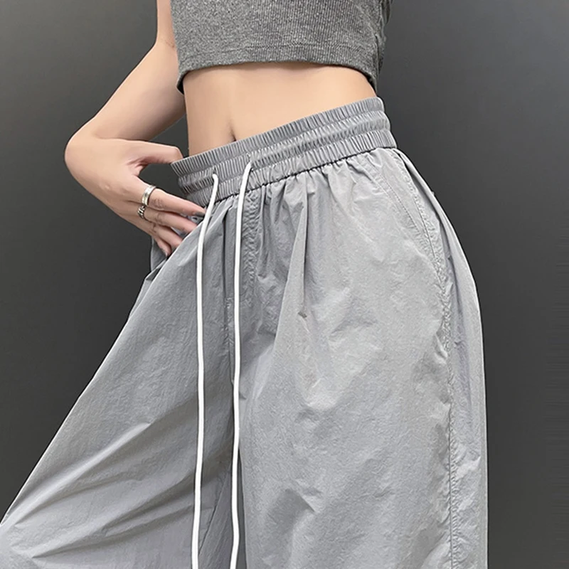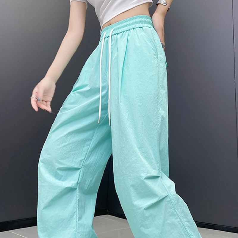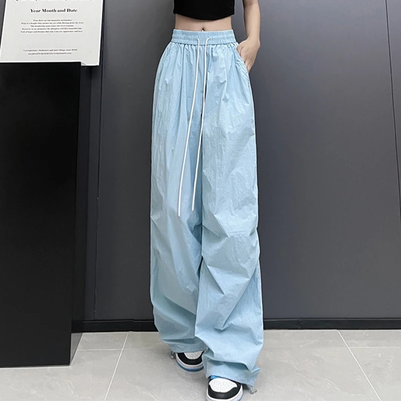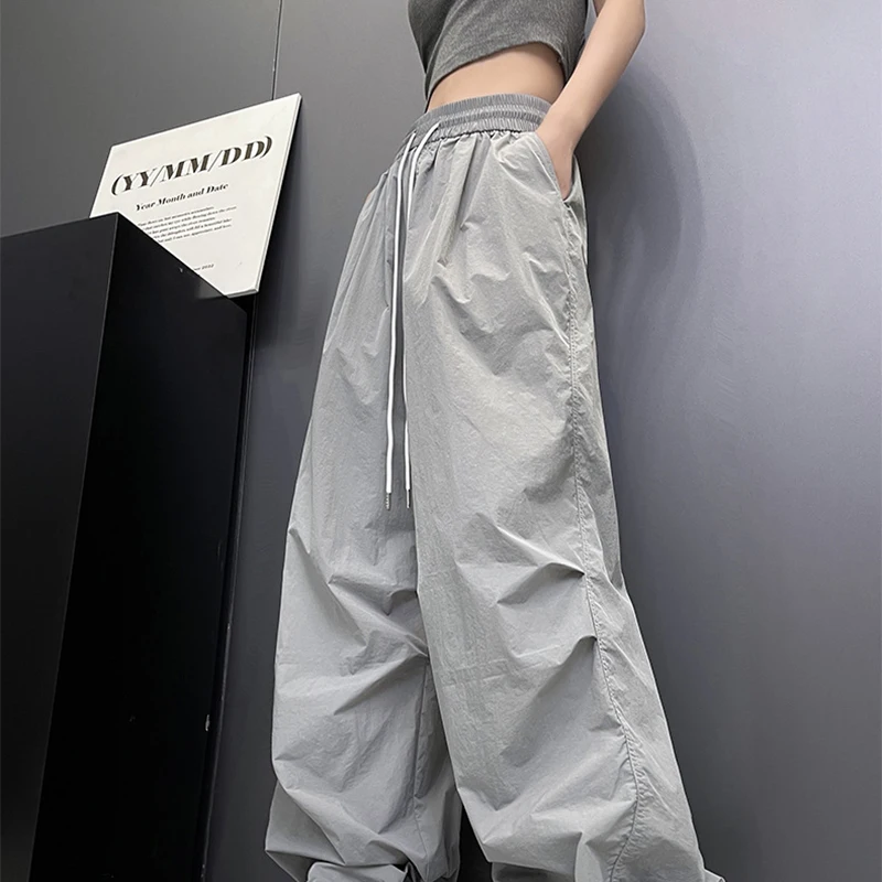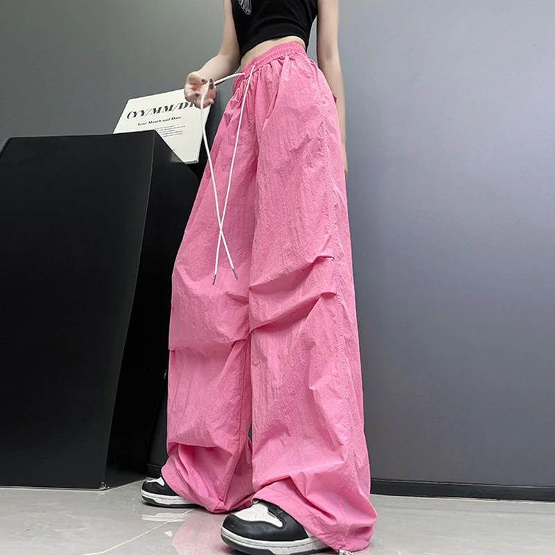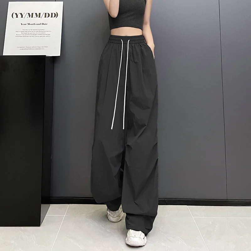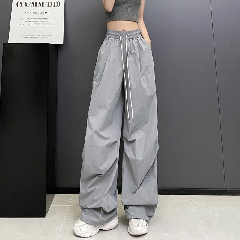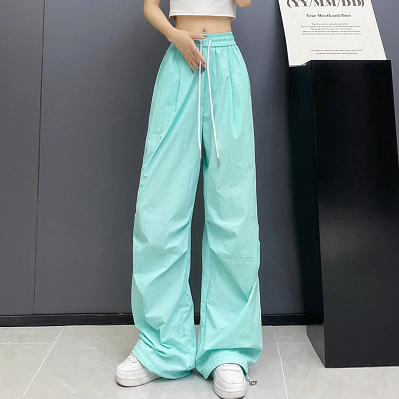 Hnewly Streetwear Solid Color Pleated Cargo Pants Women Drawstring High Waist Pants Woman Casual Loose Pockets Sports Trousers Female