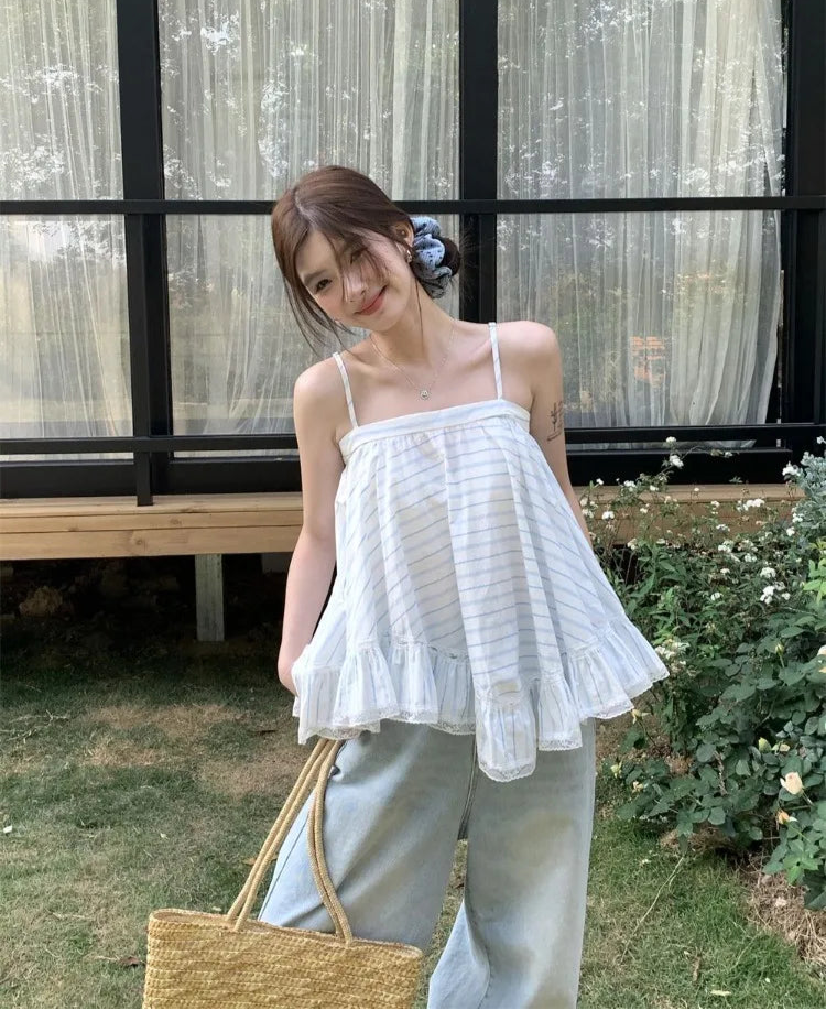 Hnewly Striped Camis Women Lace Patchwork Summer Fashion Loose Slash Neck Chic Sweet Tank Tops Female Casual Backless