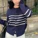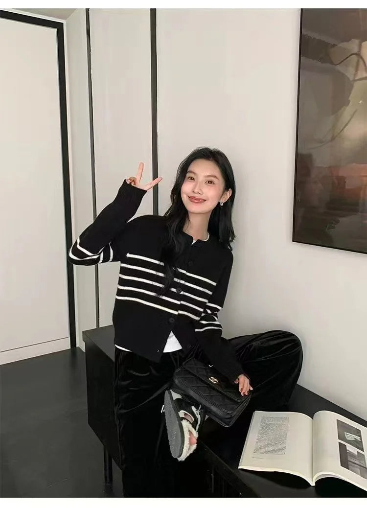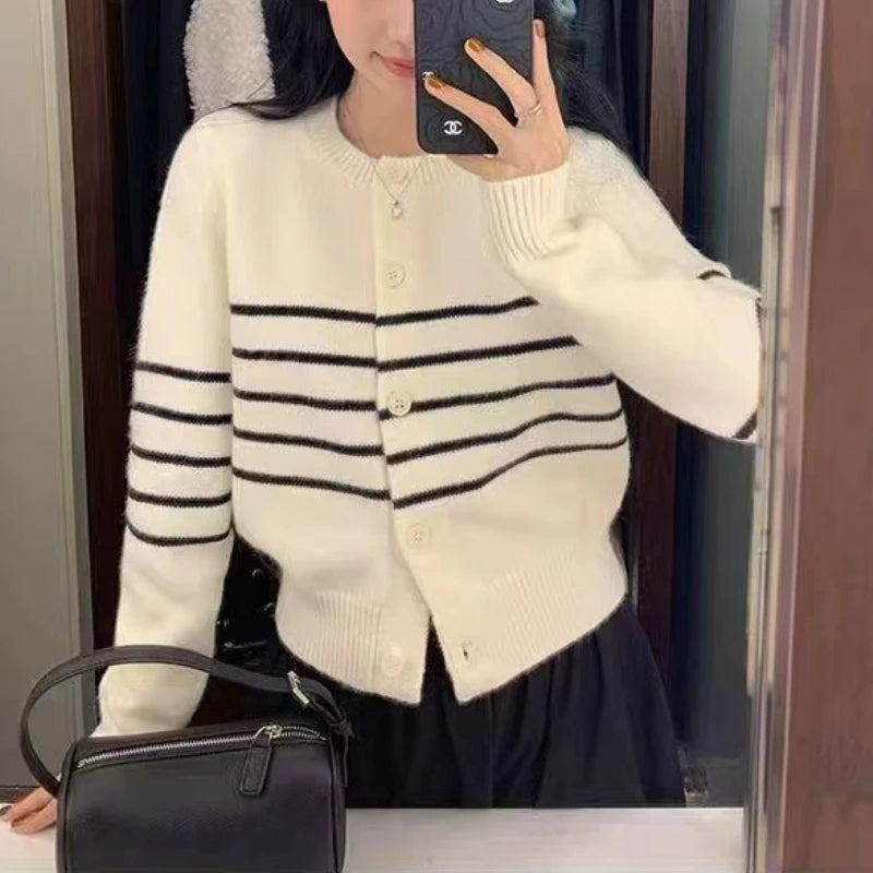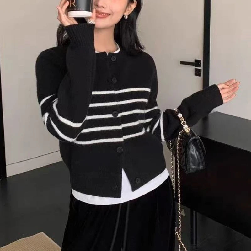 Hnewly Striped Cardigan Sweater Women Long Sleeve O-neck Button-down Striped Knit Jacket Cardi Teen-girl Fall Winter Casual Outfit