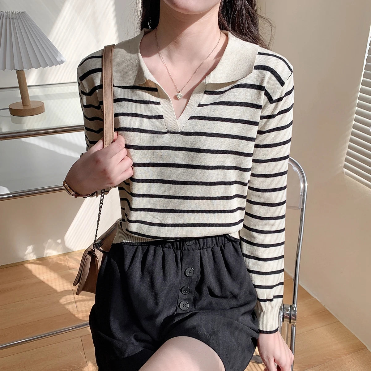Hnewly Striped Knit Pullover Sweater Women's Autumn 2025 New Lapel Shirt V-neck Loose Long Sleeve T-shirt Fashion Bottoming Short Top
