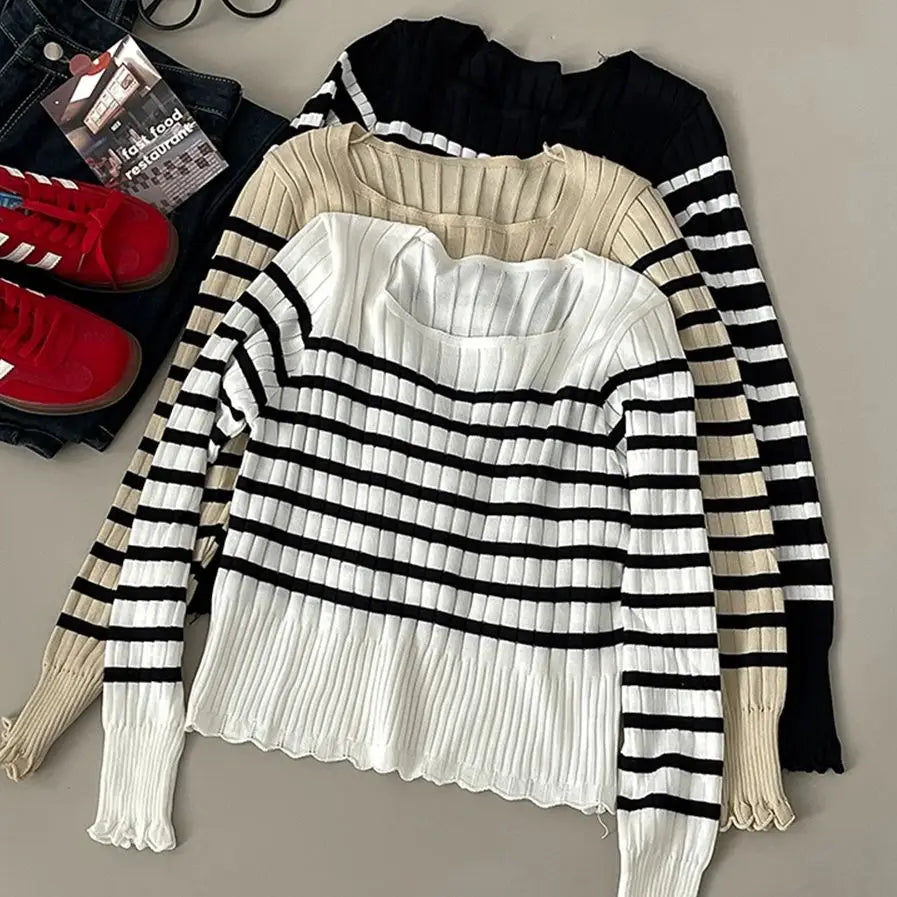 Hnewly Striped Lace Trim Knitted Sweater 2025 Women's Spring Autumn New Long Sleeve T-Shirt Slim Fit Pullover Base Layer Tops
