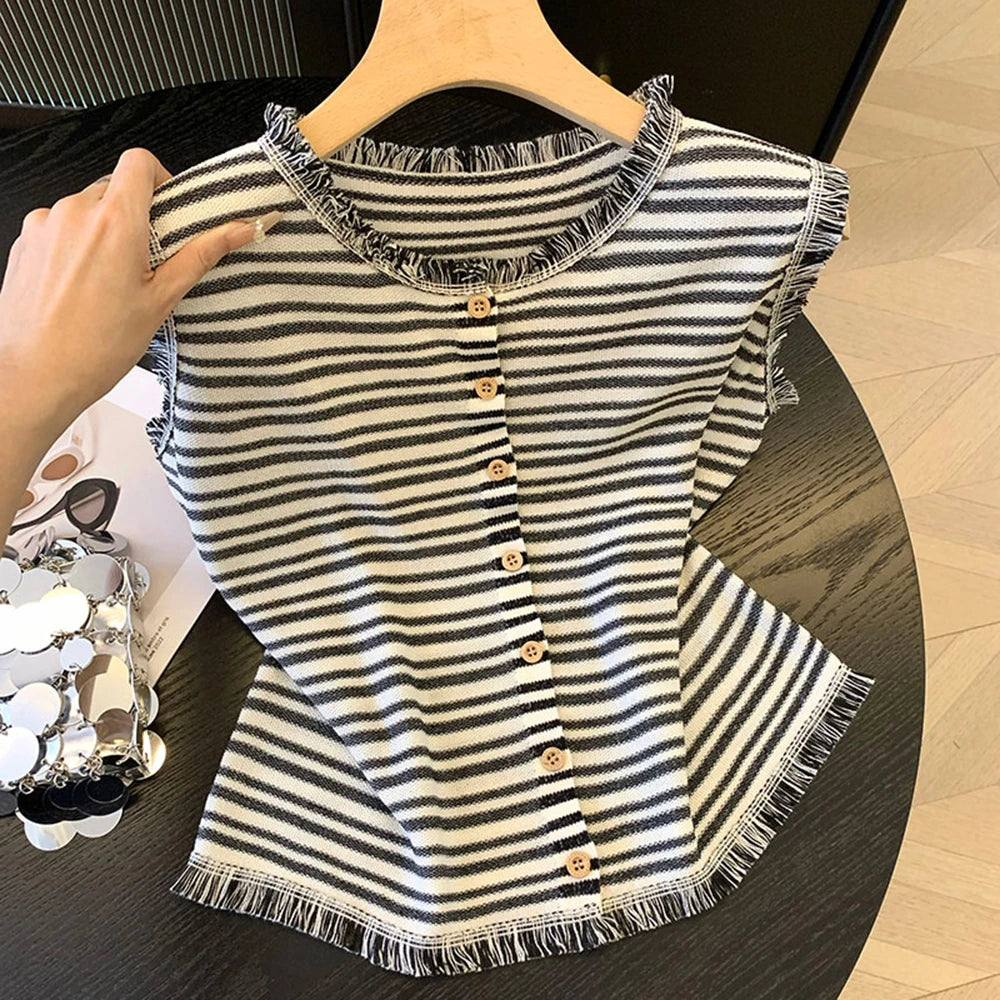 Hnewly Striped Round Neck Knitted Sweater Cardigan Women's Tassel Sleeveless Vest Tops Single Breasted Versatile Fashion Jacket