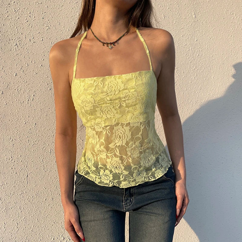 Hnewly Summer Casual Bandage Backless Lace Camis Holiday Casual Patchwork Lace-up Halter Cropped Top y2k Aesthetic Tees Vintage