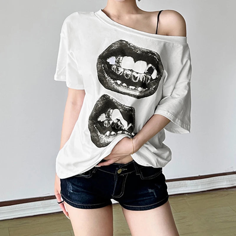 Hnewly Summer Chic Print Loose T-shirt Streetwear y2k Short Sleeve Off-shoulder T Shirt for Women Casual Basic Knit Tee Harajuku