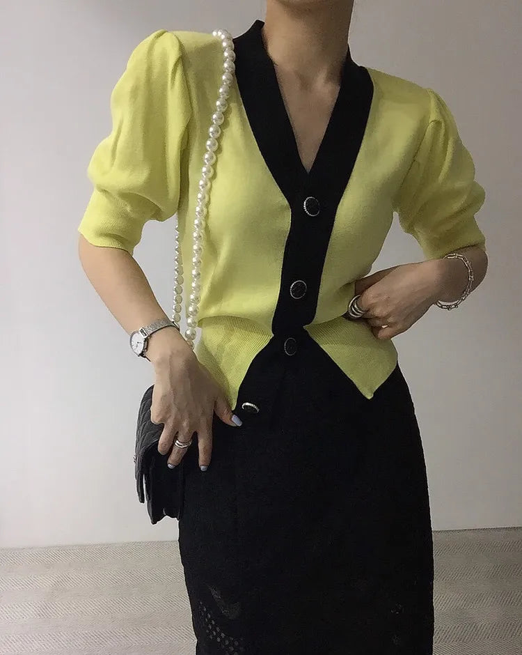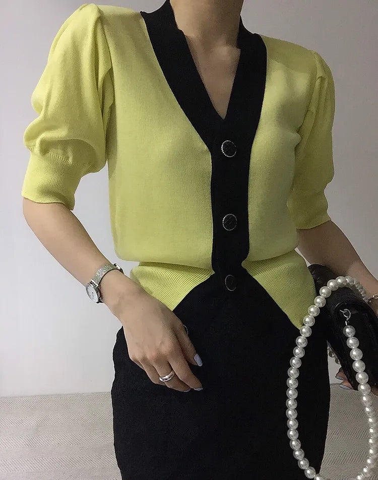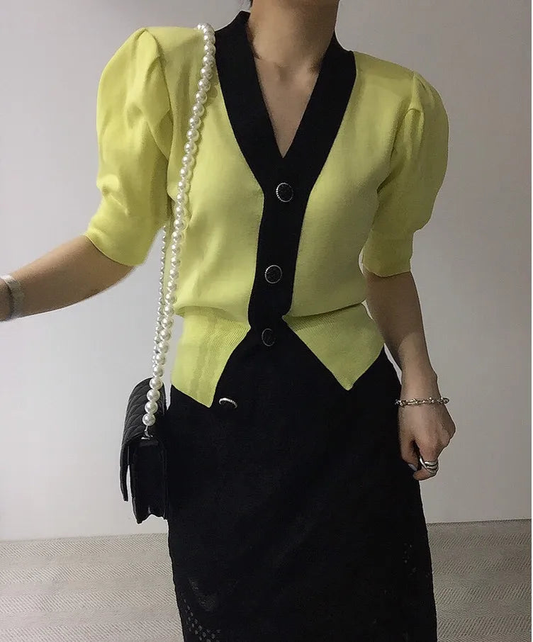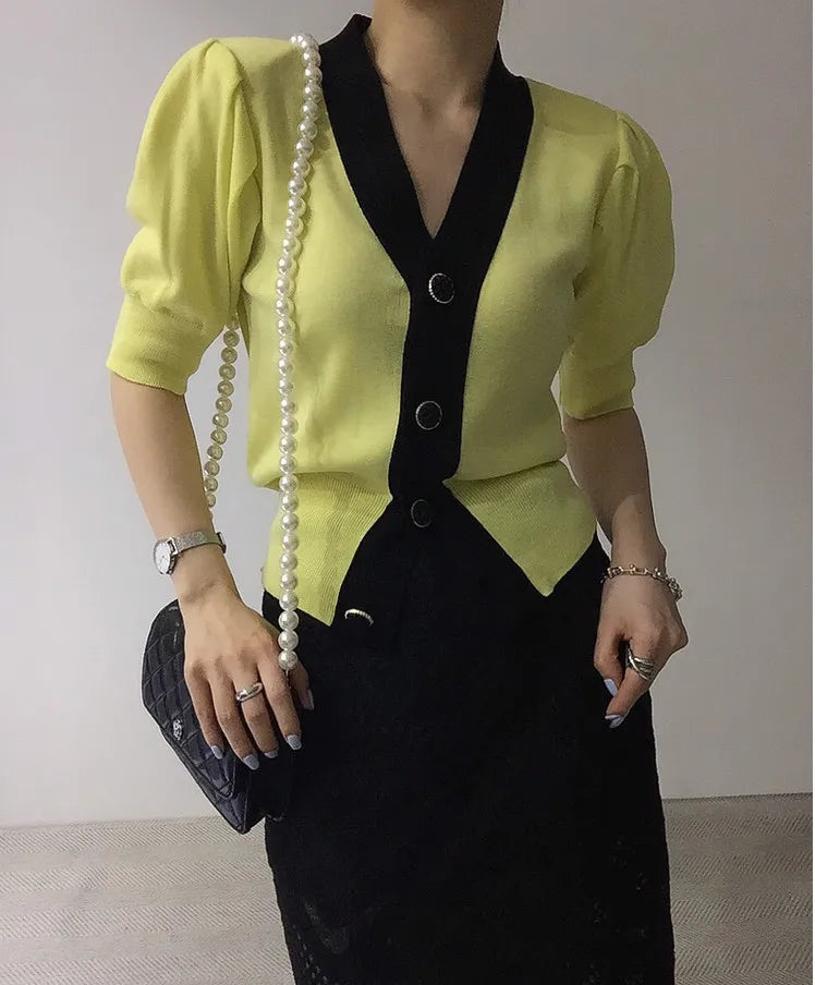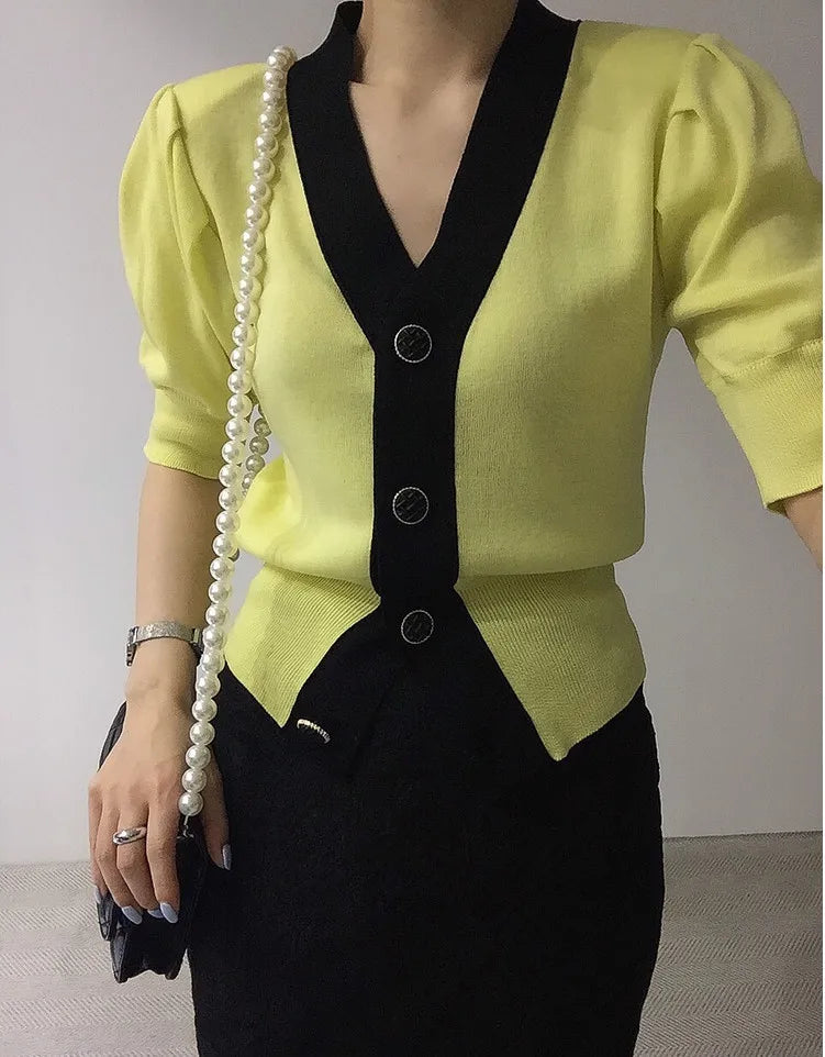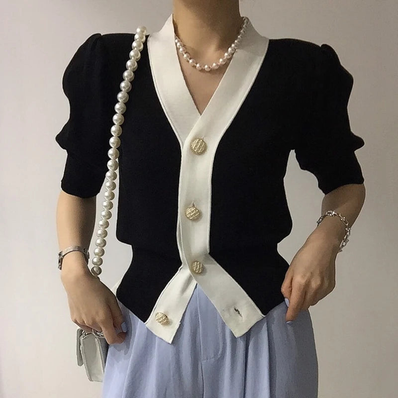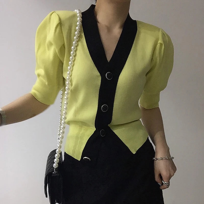 Hnewly Summer Elegant Puff Short Sleeve Cardigan Office Lady 2023 Korean Contrast Single Breasted V-Neck Casual All-Match Knitted Tops