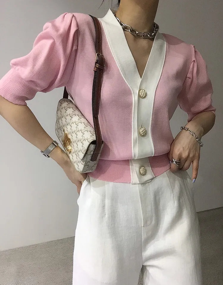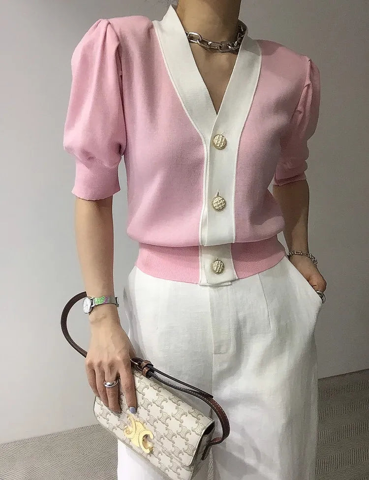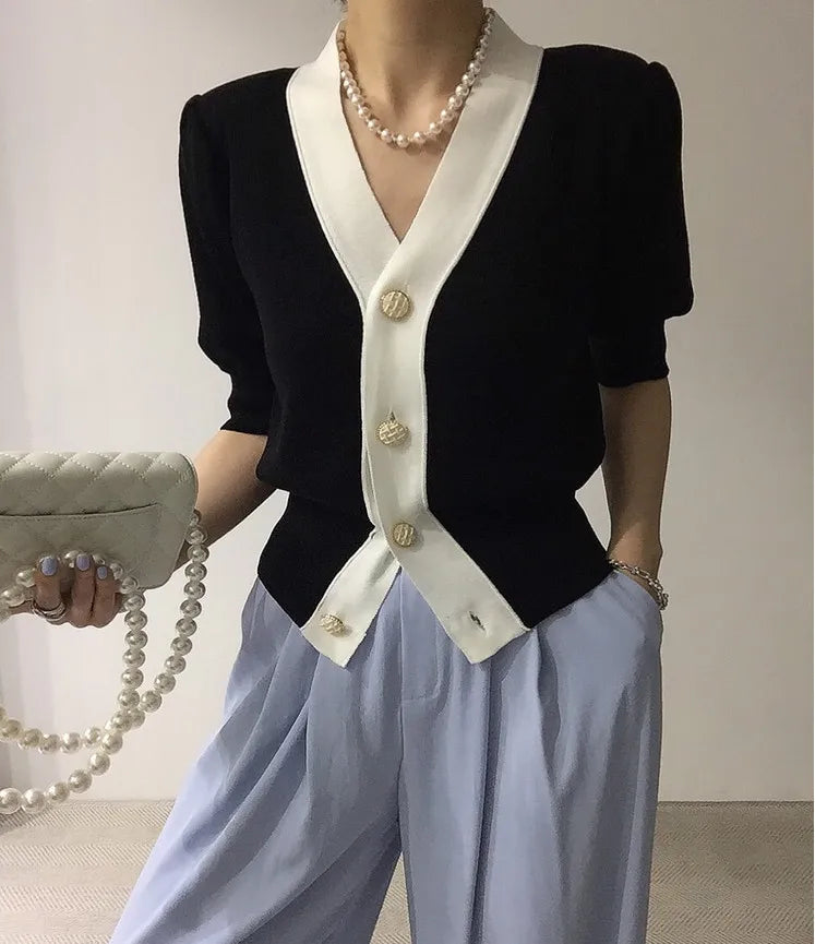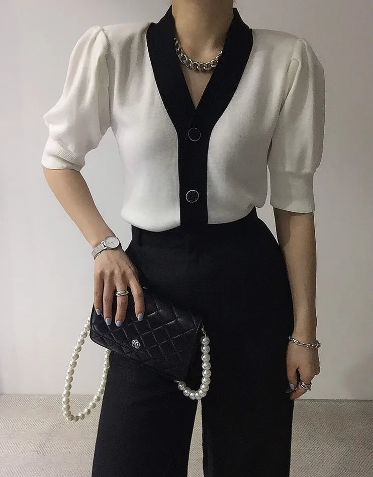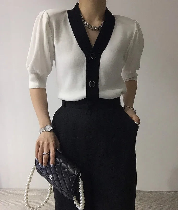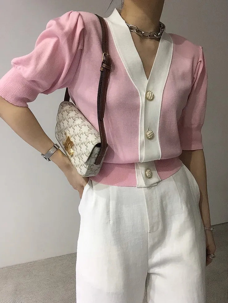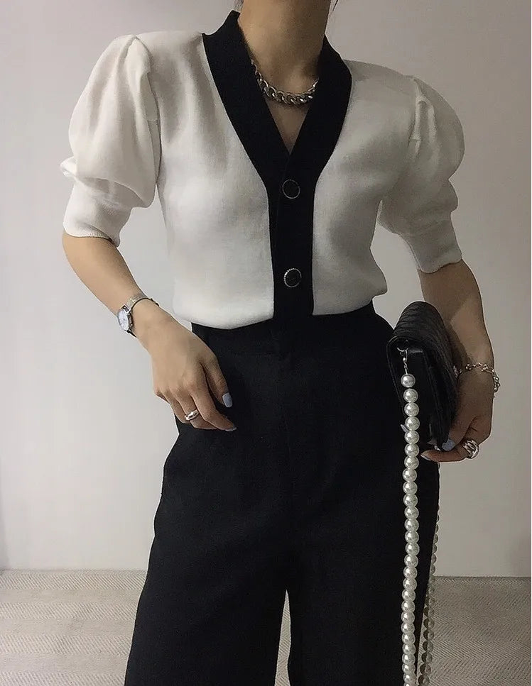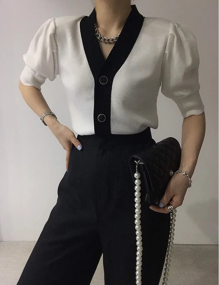Hnewly Summer Elegant Puff Short Sleeve Cardigan Office Lady 2023 Korean Contrast Single Breasted V-Neck Casual All-Match Knitted Tops
